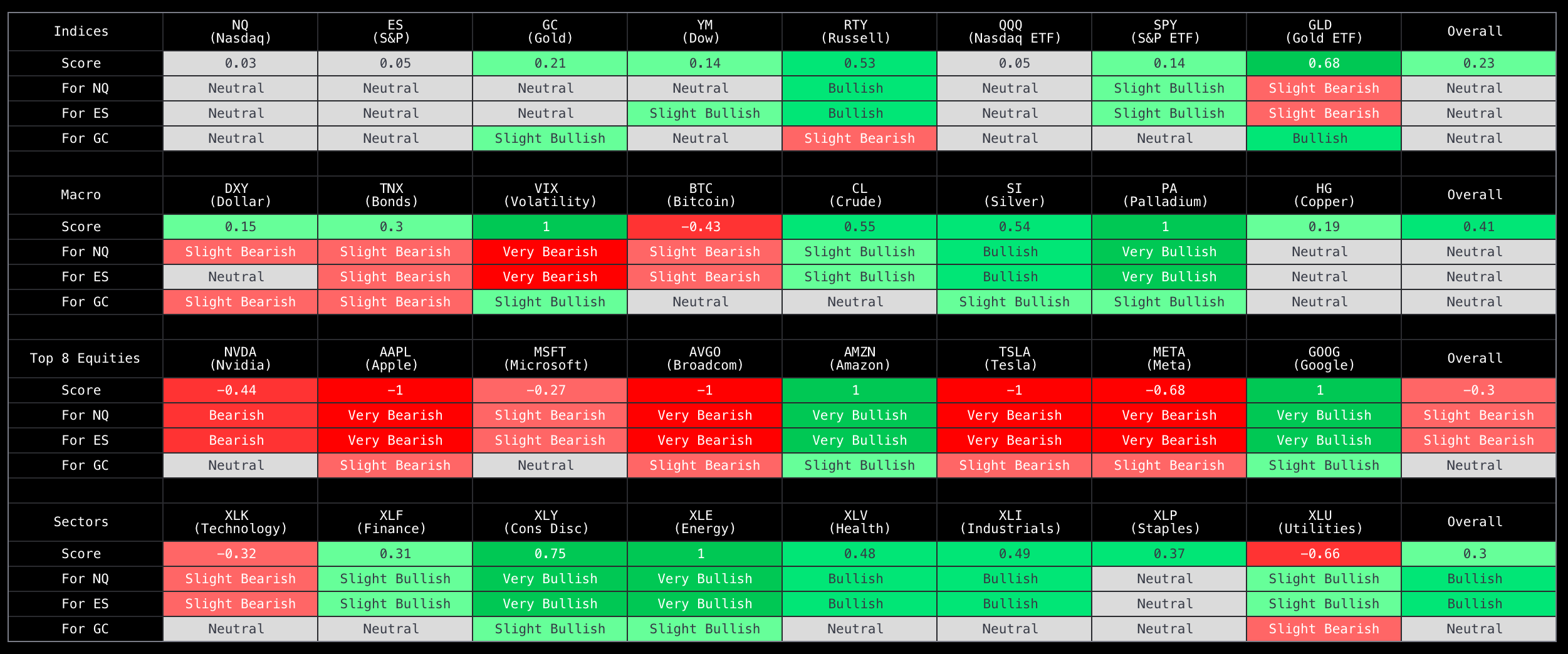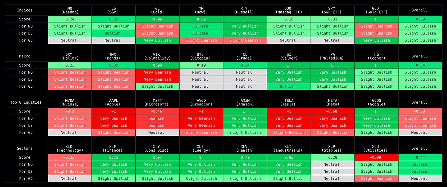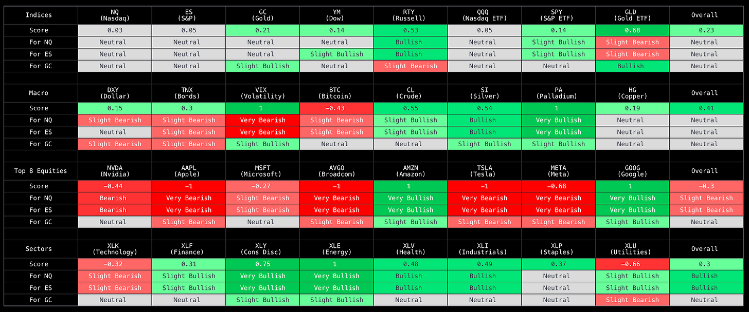 Proprietary matrix powered by AI that provides market breadth and what it means for NQ, ES, and GC futures.