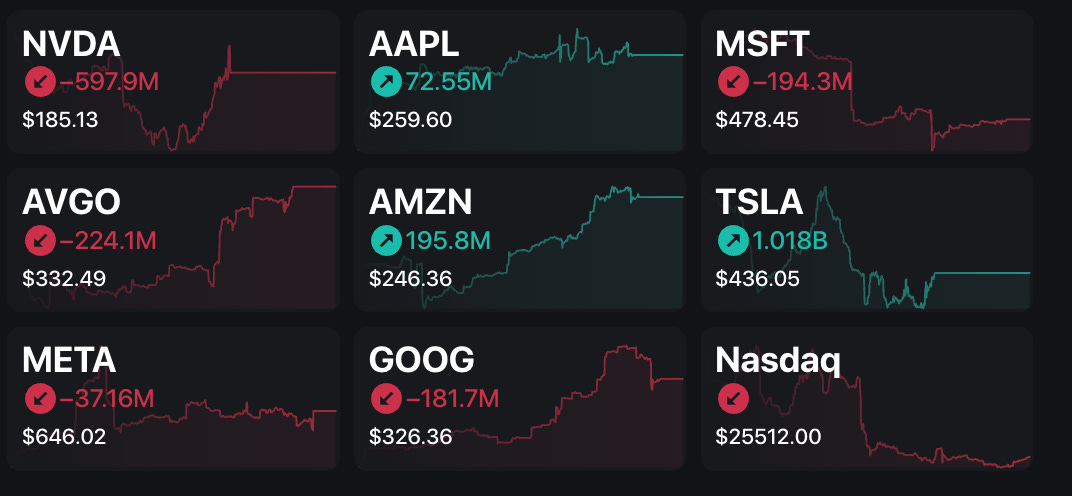 NVDA trying to push up, but options flow is bearish, AAPL breaking down with red CVD, but we have bullish option flow — same for TSLA.