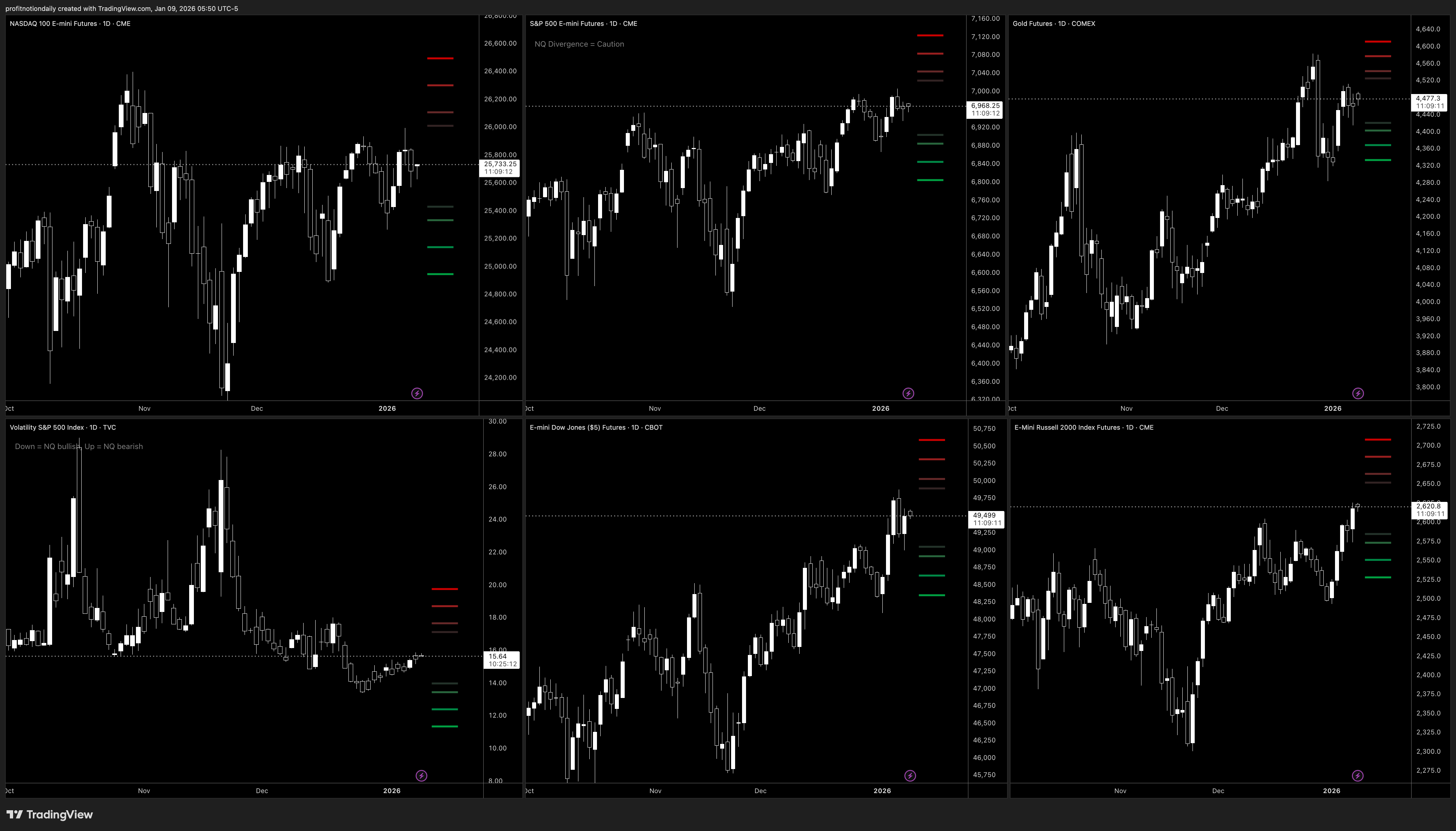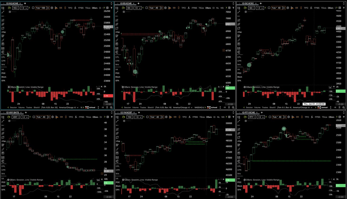 All indices are trending higher with RTY making new highs, and ES flirting with more highs. NQ swept recent resistance but not able to close above yet. VIX is steadily rising, but still down near 2025 lows.