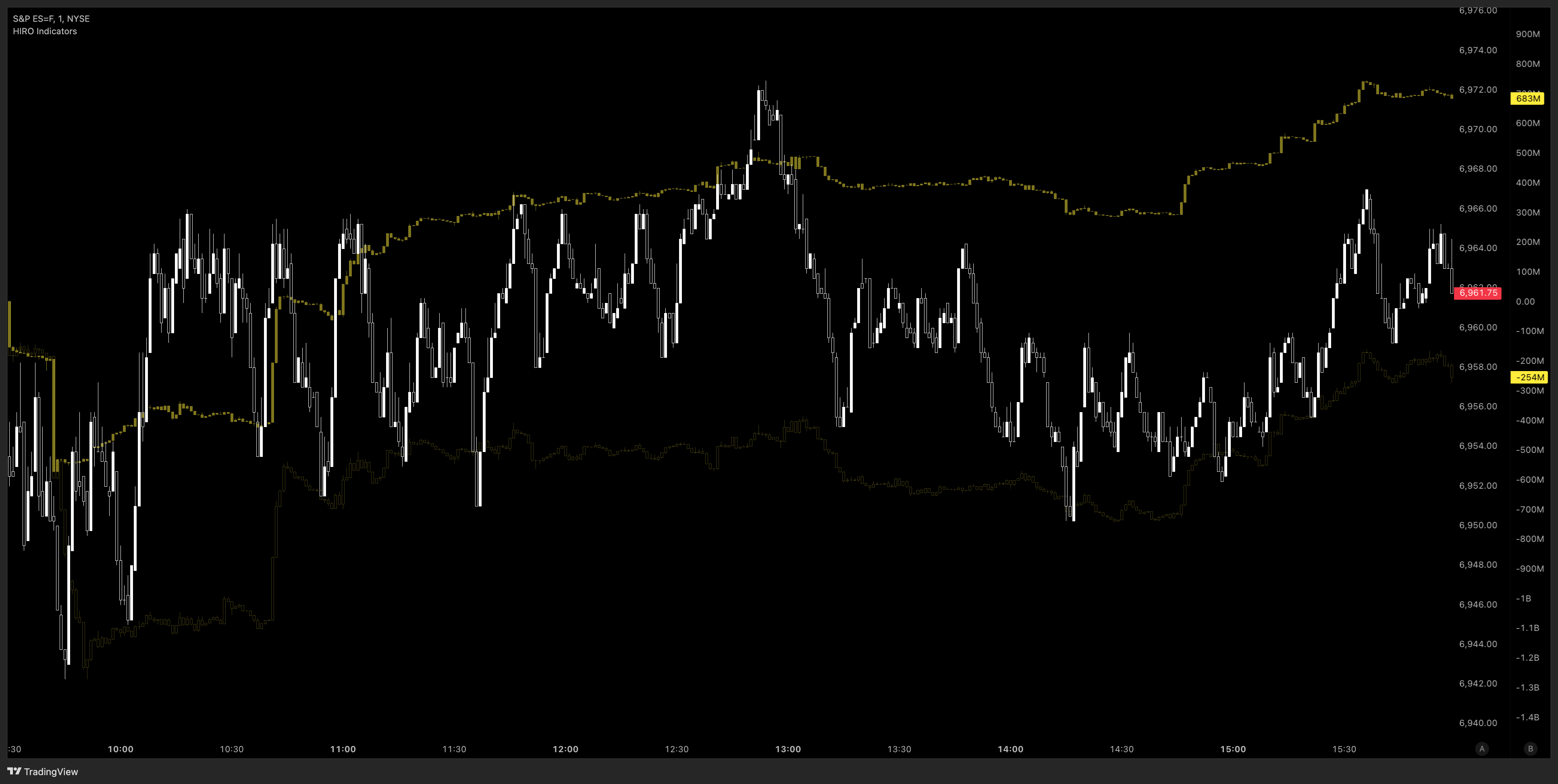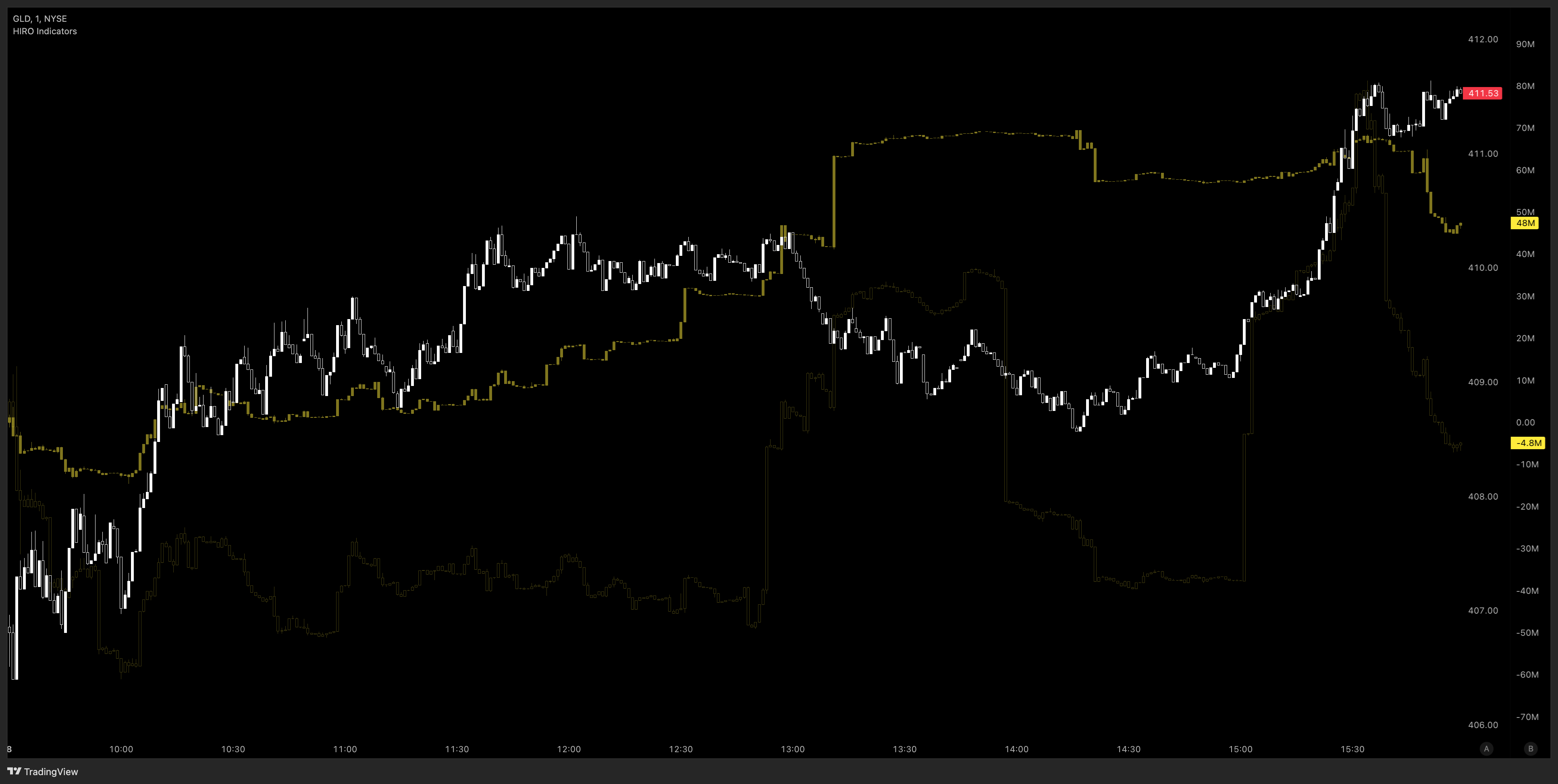 Bright yellow is 0DTE / short dated options, dim yellow is longer dated options flow.