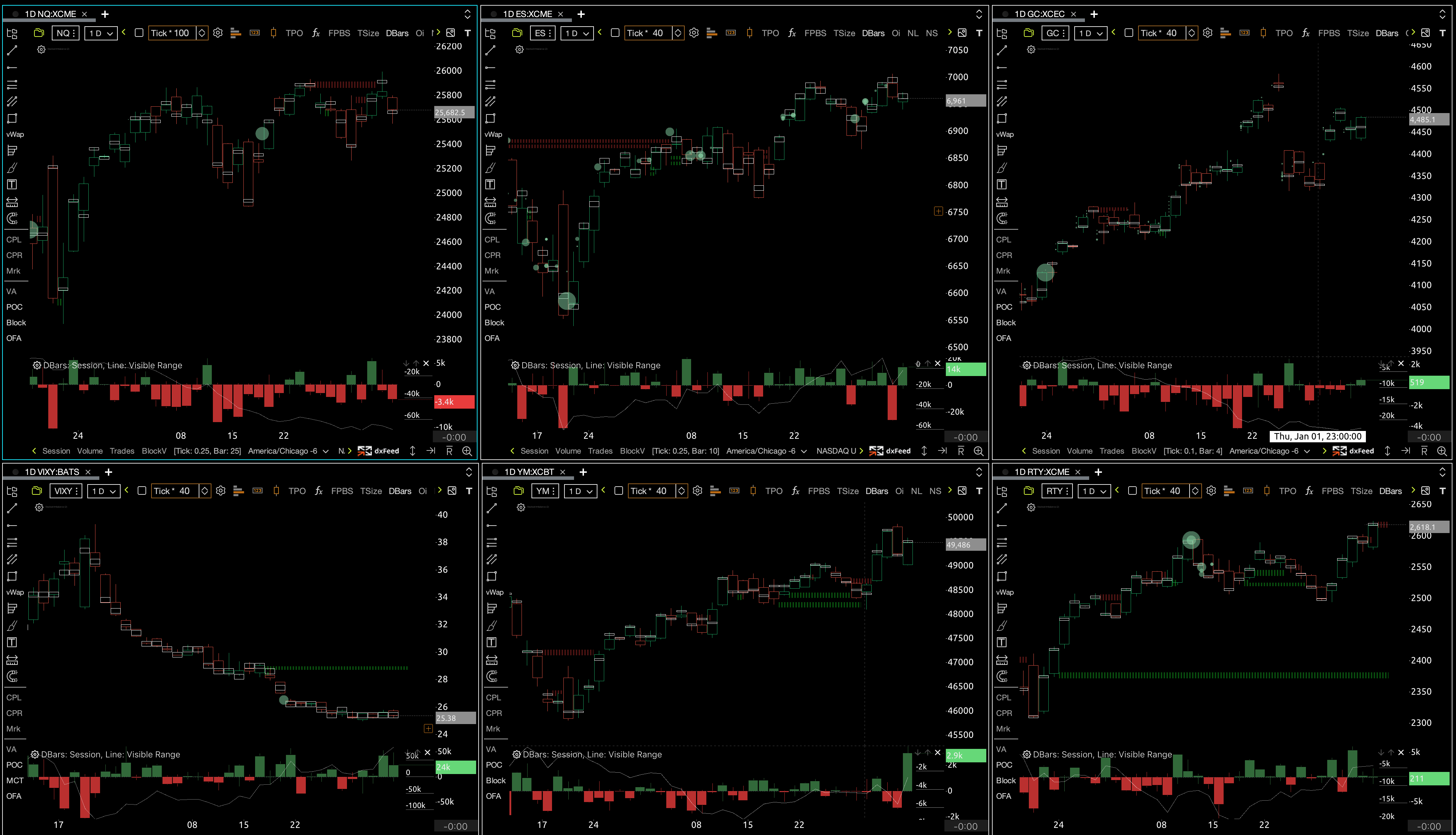 GC is printing increasing green CVD int he last two days. Big green CVD on YM, and neutral on RTY. Short term VIX looks like we want to increase.