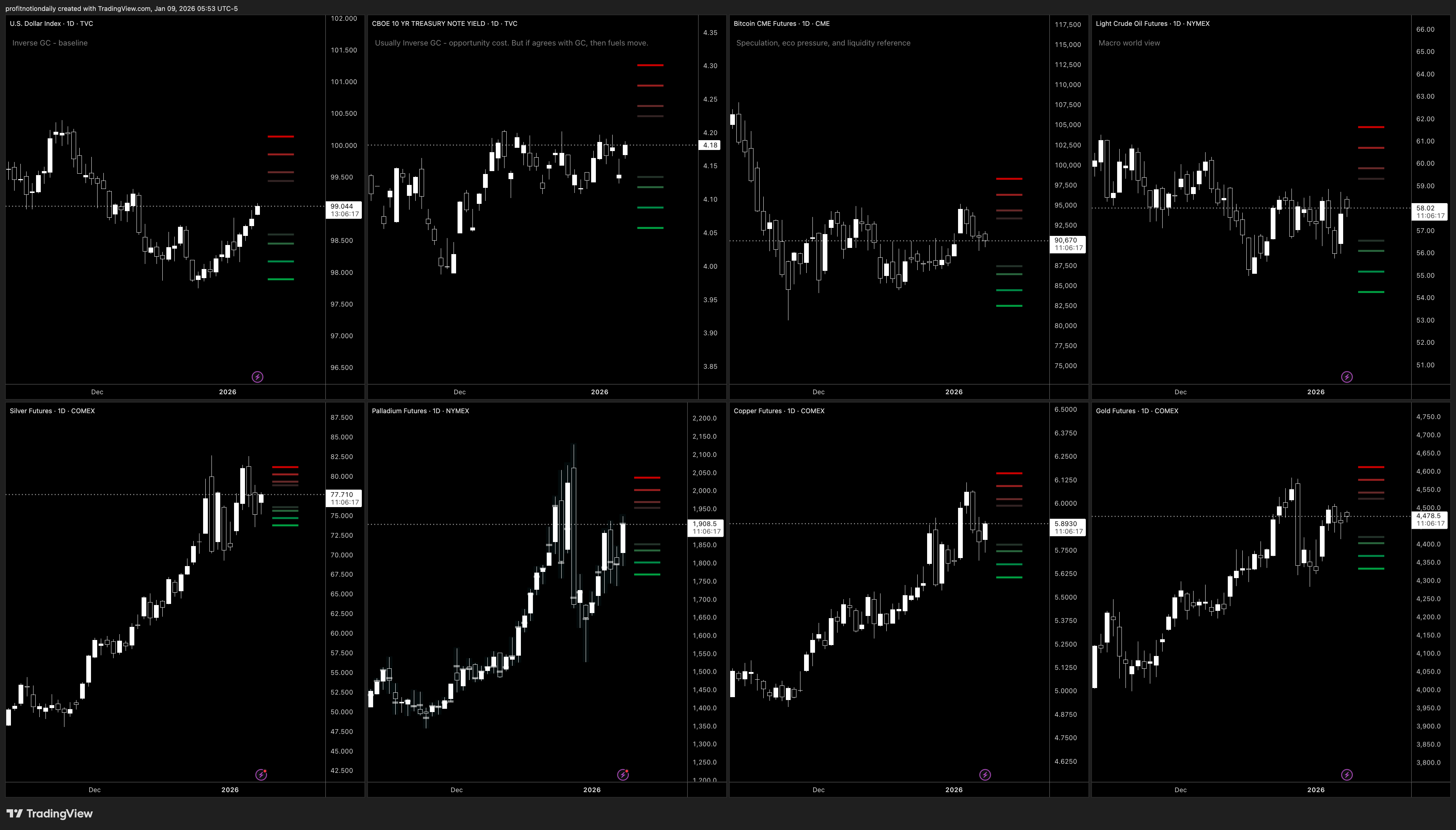 Overall: Metals are bullish. Bitcoin is sideways with bullish options. Oil is sideways with bullish options. The dollar is showing strength so that could temper things. Treasury yields are sideways which means we could go either way.