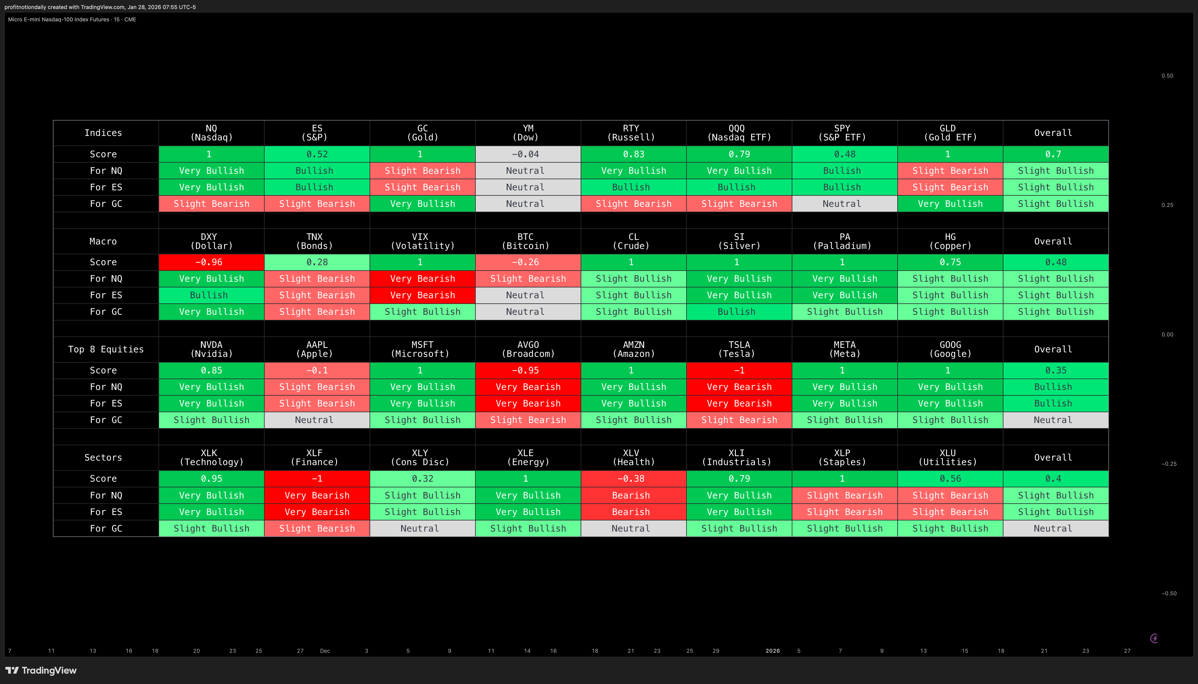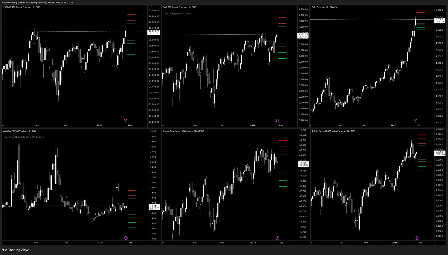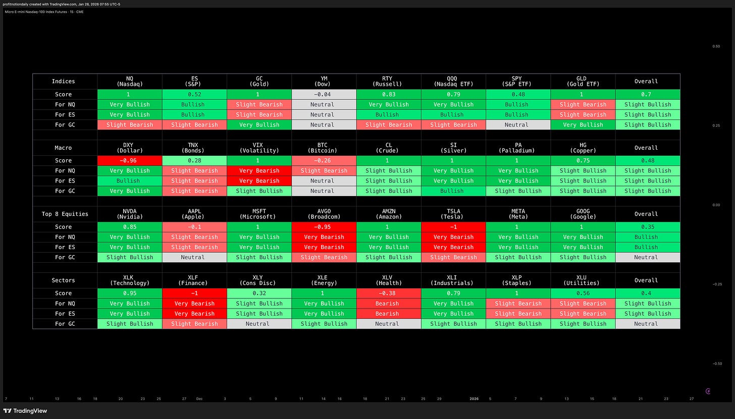 🟢 NQ Bullish, 🟢 ES Bullish, 🟢 GC Bullish, 🟡 YM Neutral, 🟢 RTY Bullish