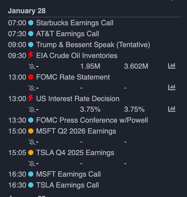 ⚠️ News/Events: FOMC Rate Decision. TSLA, MSFT earnings.