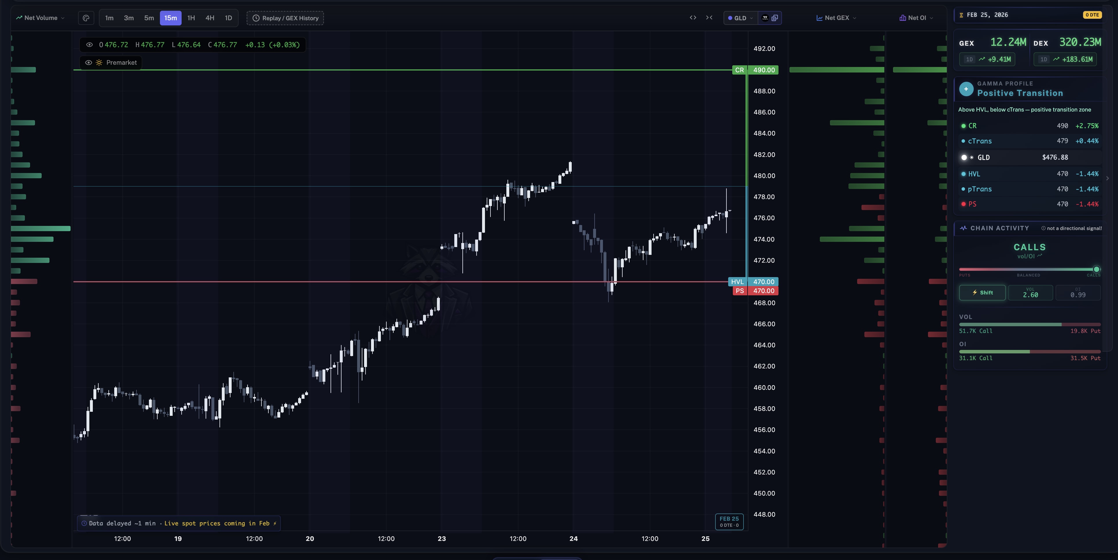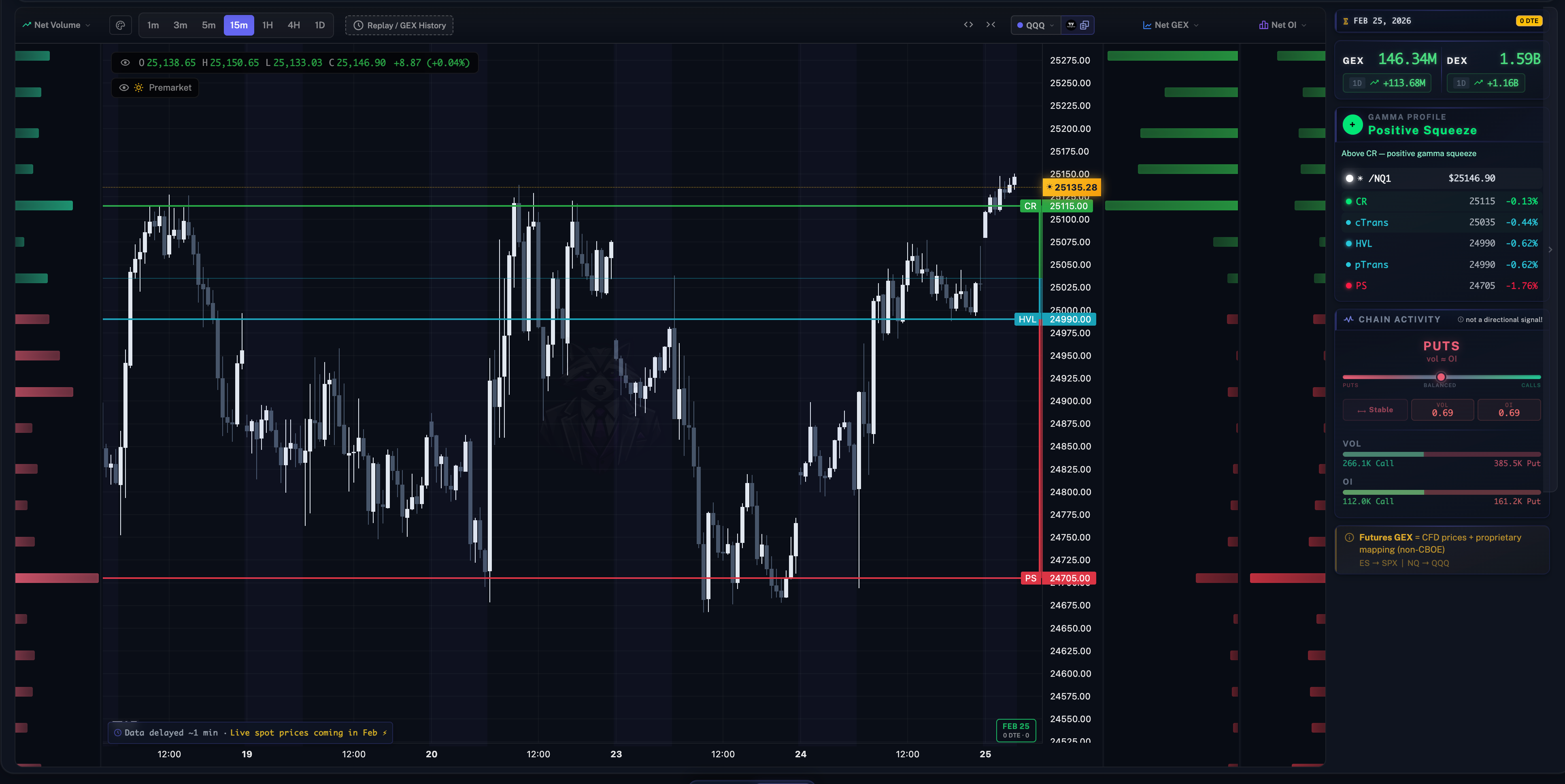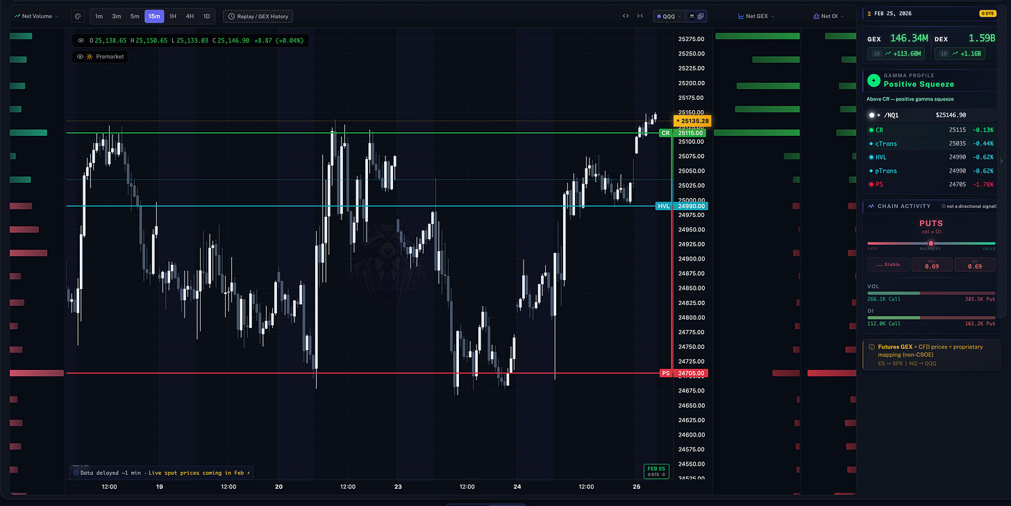 GC price action looks bullish but options and orderflow don’t agree. Price for NQ and ES are trading near or above the top positive GEX levels as well.