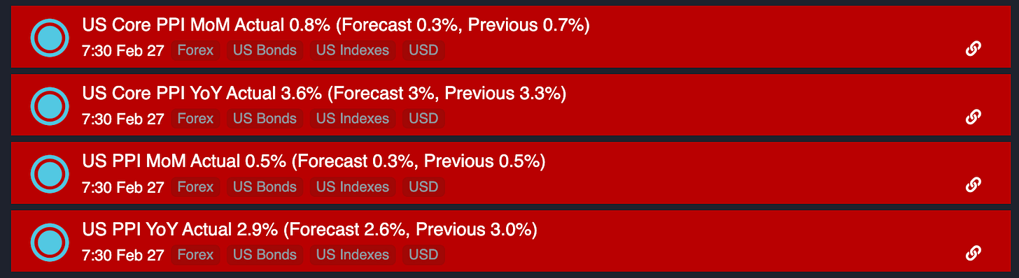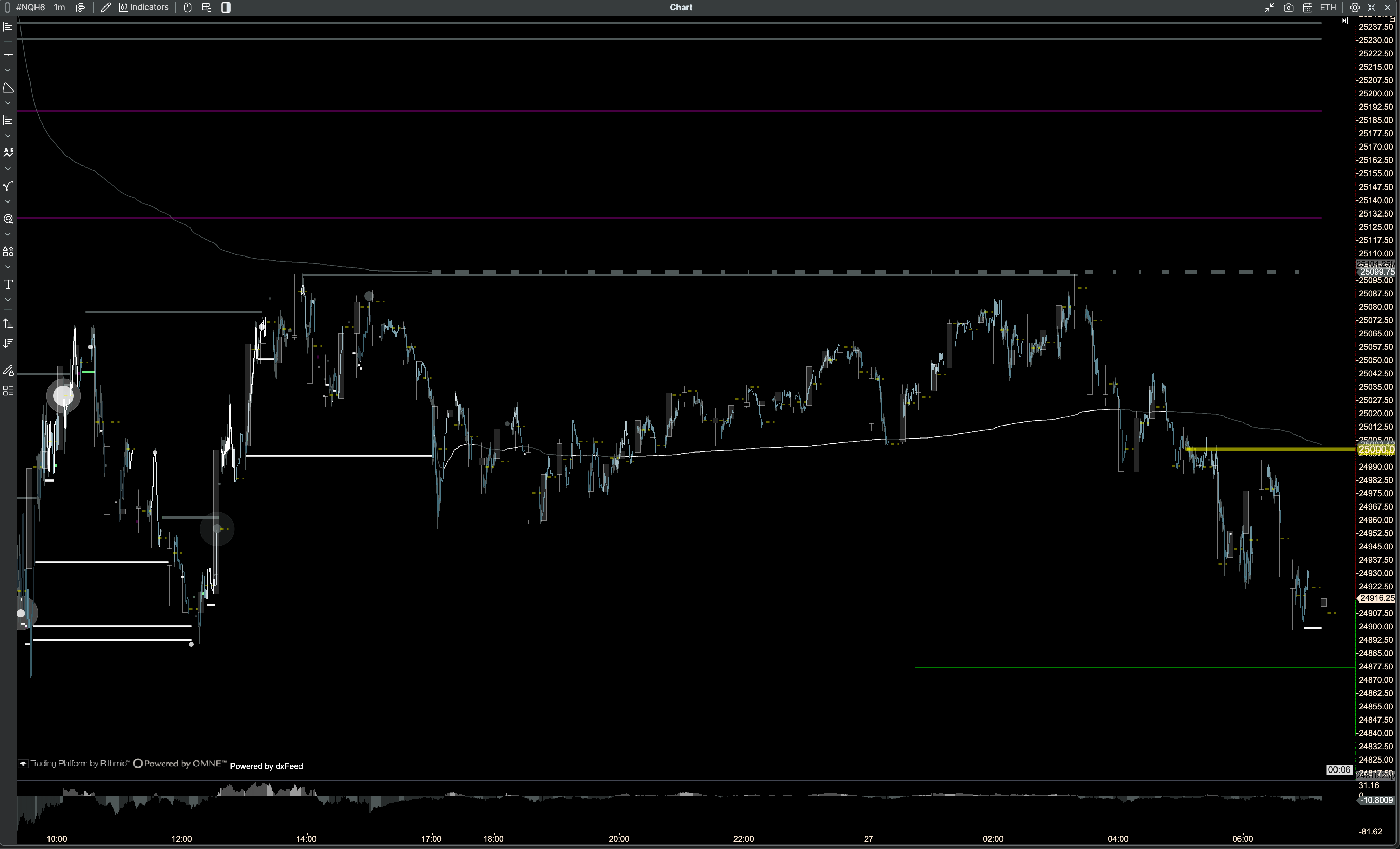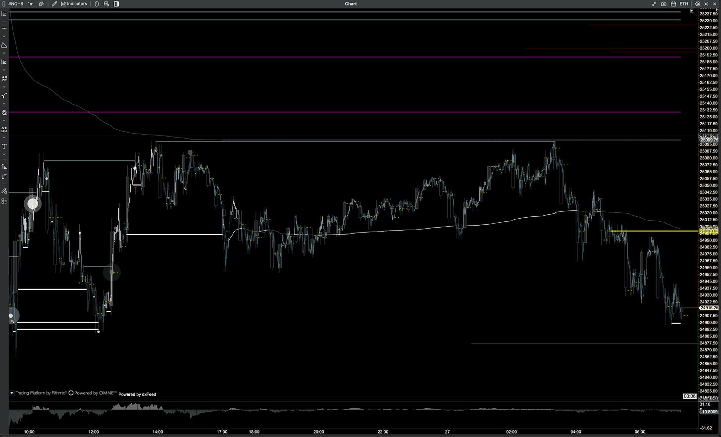 <n/a after PPI> / 25065, 25020, 24695 [ 🟢 ]Notes for today: GC pushing up, NQ and ES falling over after PPI, but looking to test Daily upward trend line. Waiting for RTH open and will see what levels look like. Always open to both sides, but down seems like the least resistance, but lets see if major support holds in the next hour, as we could always push back up.