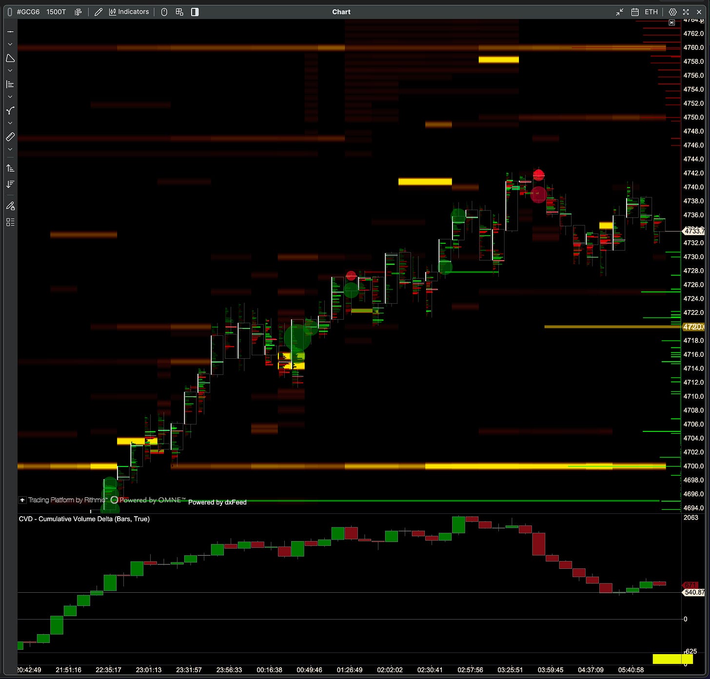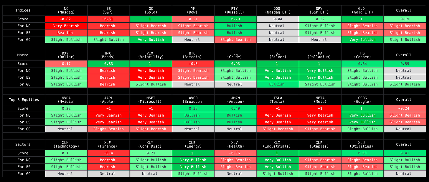 Proprietary matrix powered by AI that provides market breadth and what it means for NQ, ES, and GC futures.