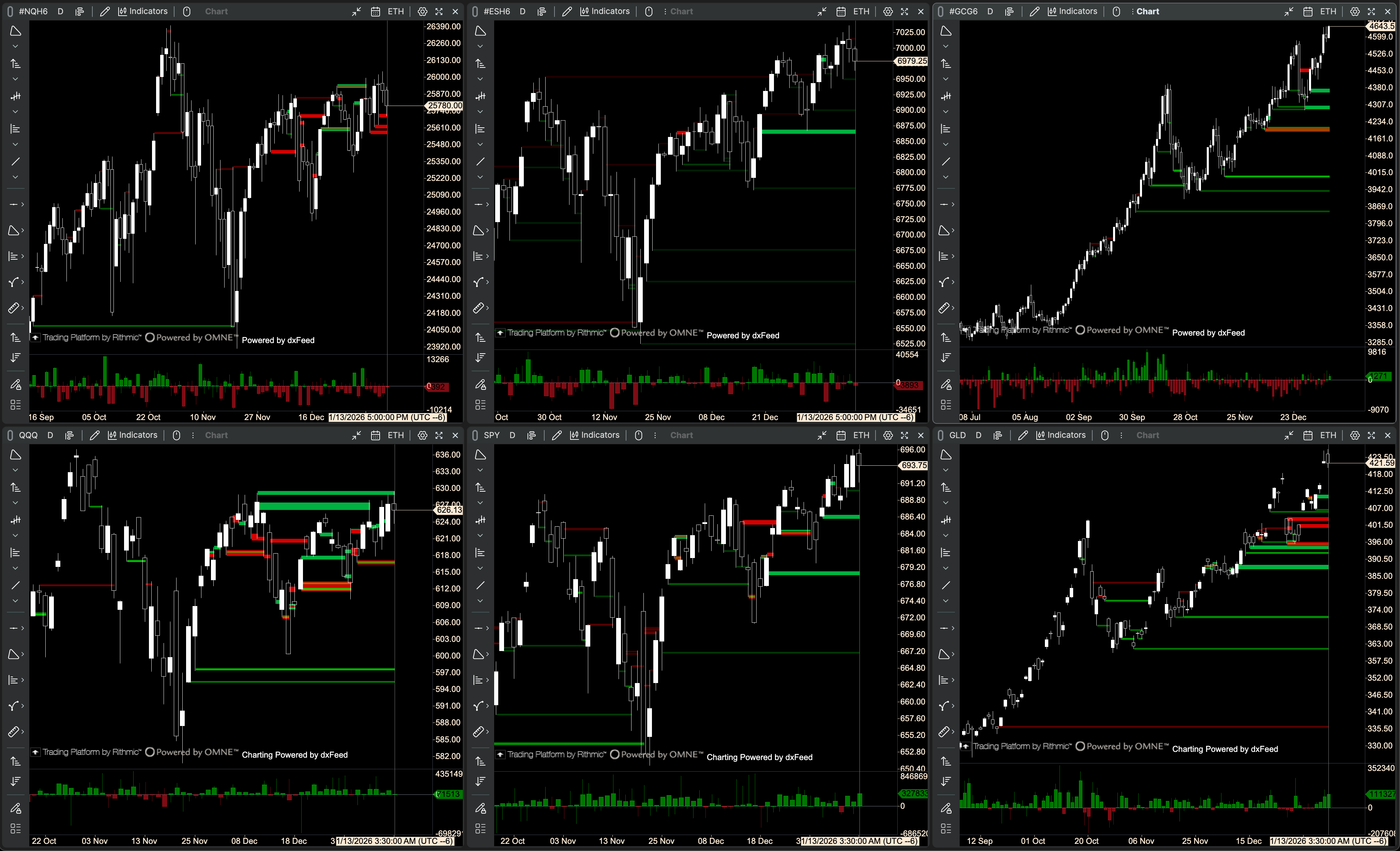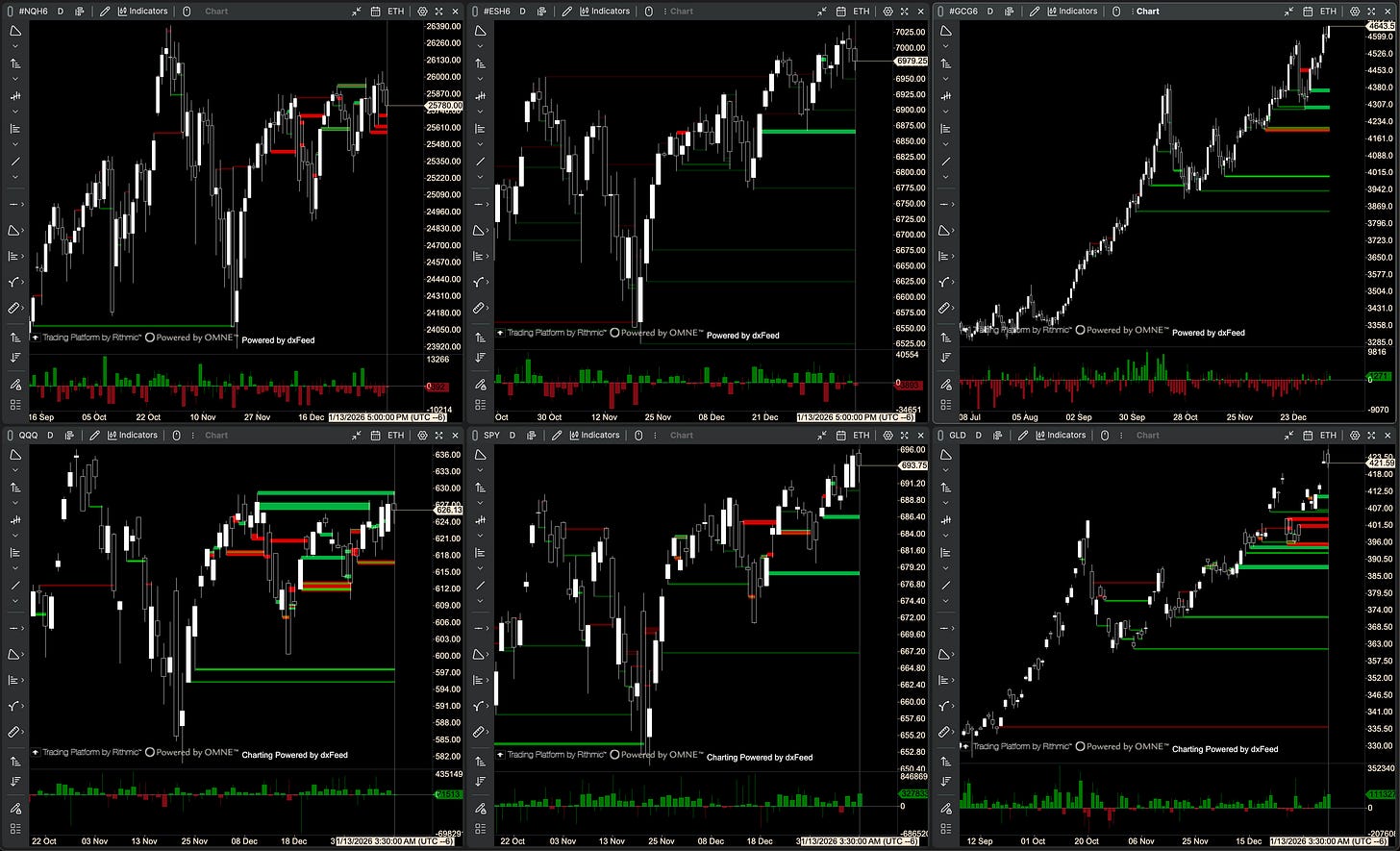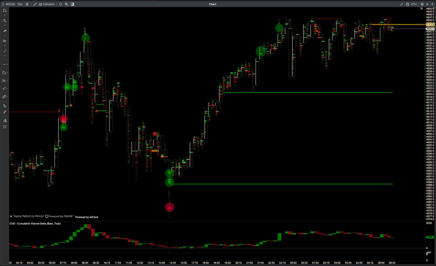 Gold/GLD agree on daily CVD yesterday, NQ and ES don’t agree.