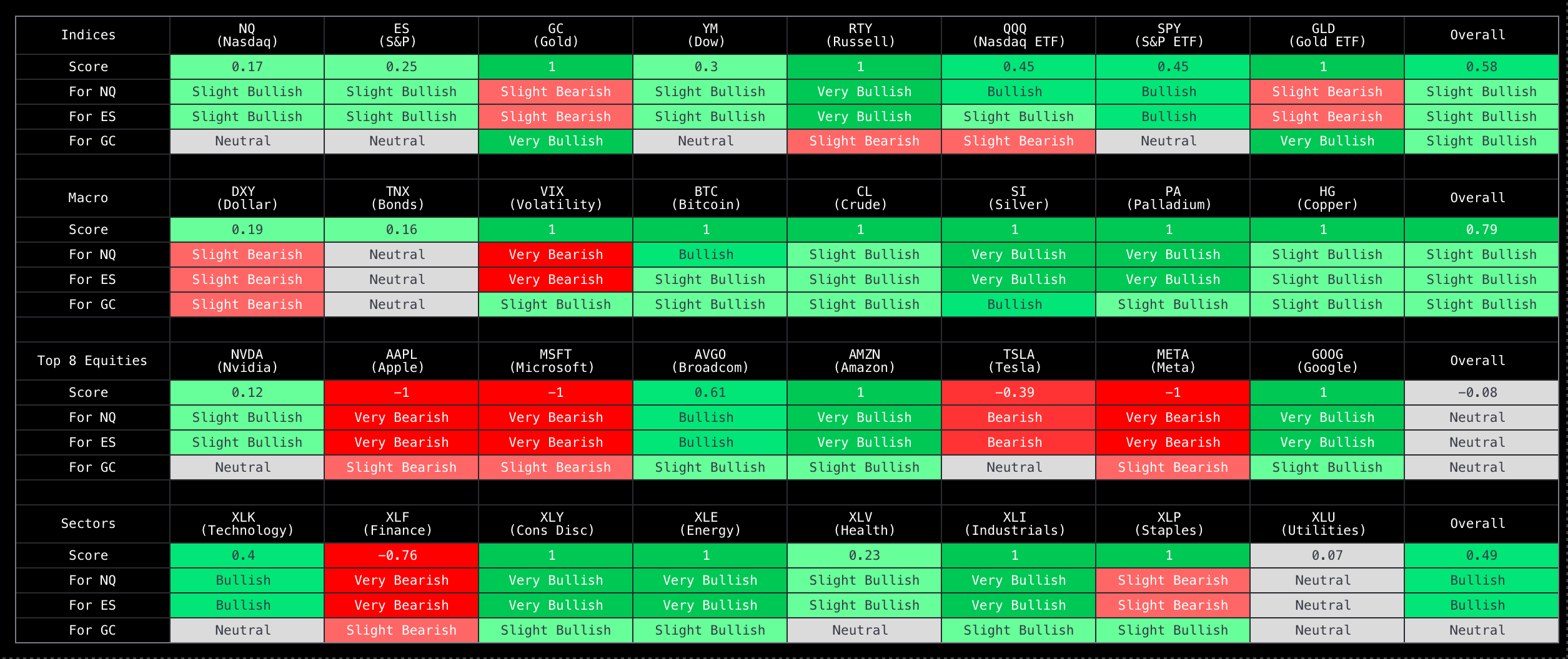 Proprietary matrix powered by AI that provides market breadth and what it means for NQ, ES, and GC futures.