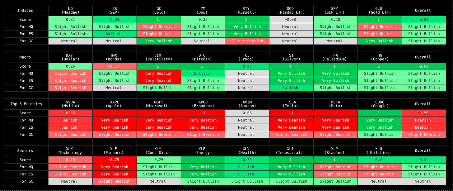 Proprietary matrix powered by AI that provides market breadth and what it means for NQ, ES, and GC futures.