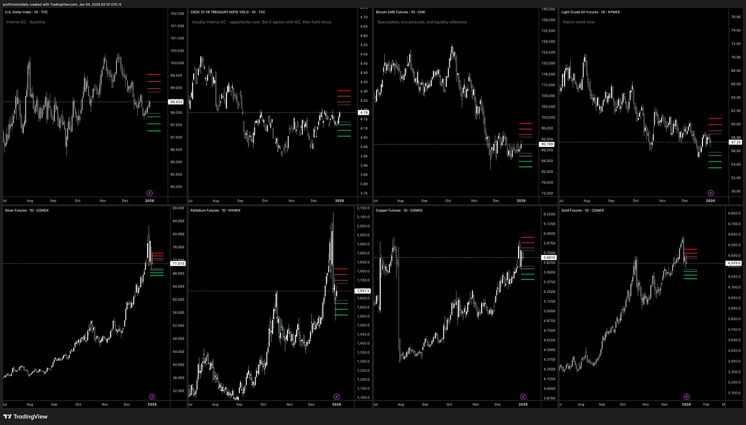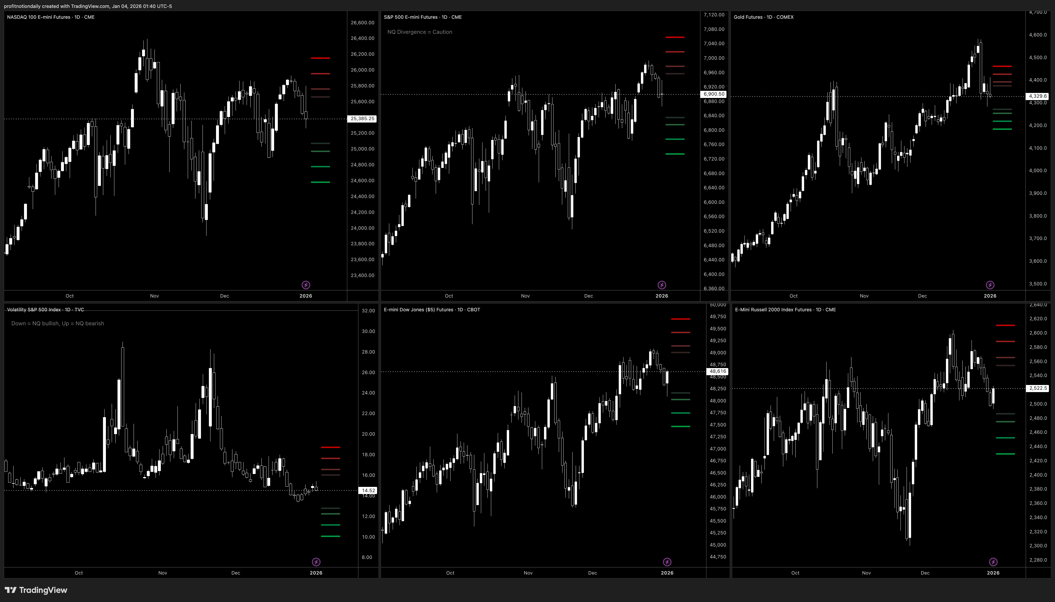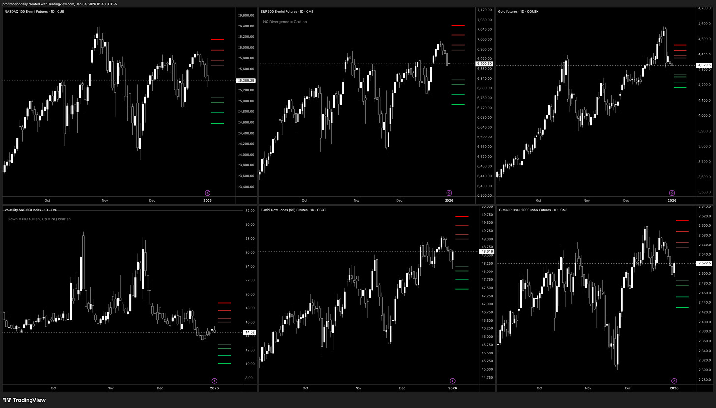 The US Venezuela news will be top of mind on Monday to see how the world and markets reacts. Aside from that, looks like Indices are rotating back into RTY and YM, while options flow is generally more bullish. ES order flow looks the strongest bullish, followed by NQ. GC seems the most bearish, so will be watching that.