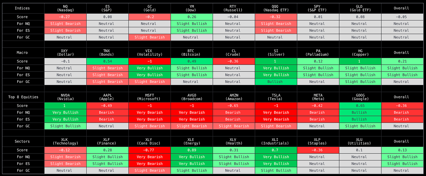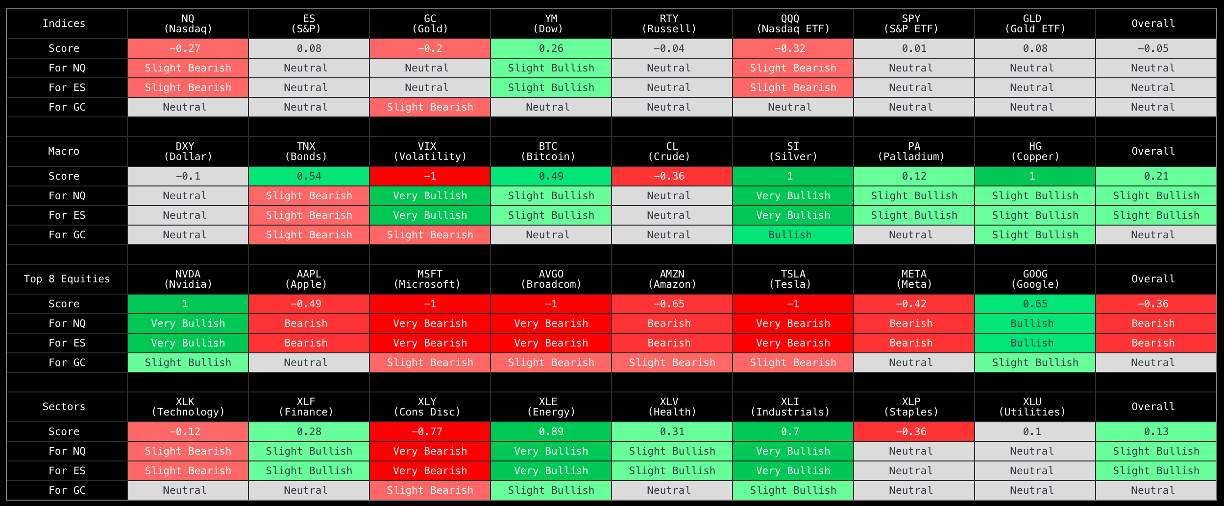 Proprietary matrix powered by AI that provides market breadth and what it means for NQ, ES, and GC futures.