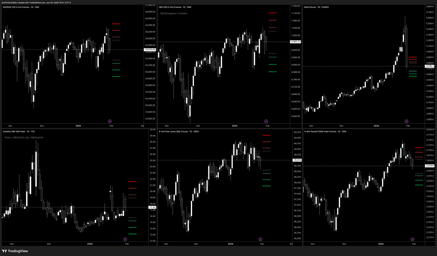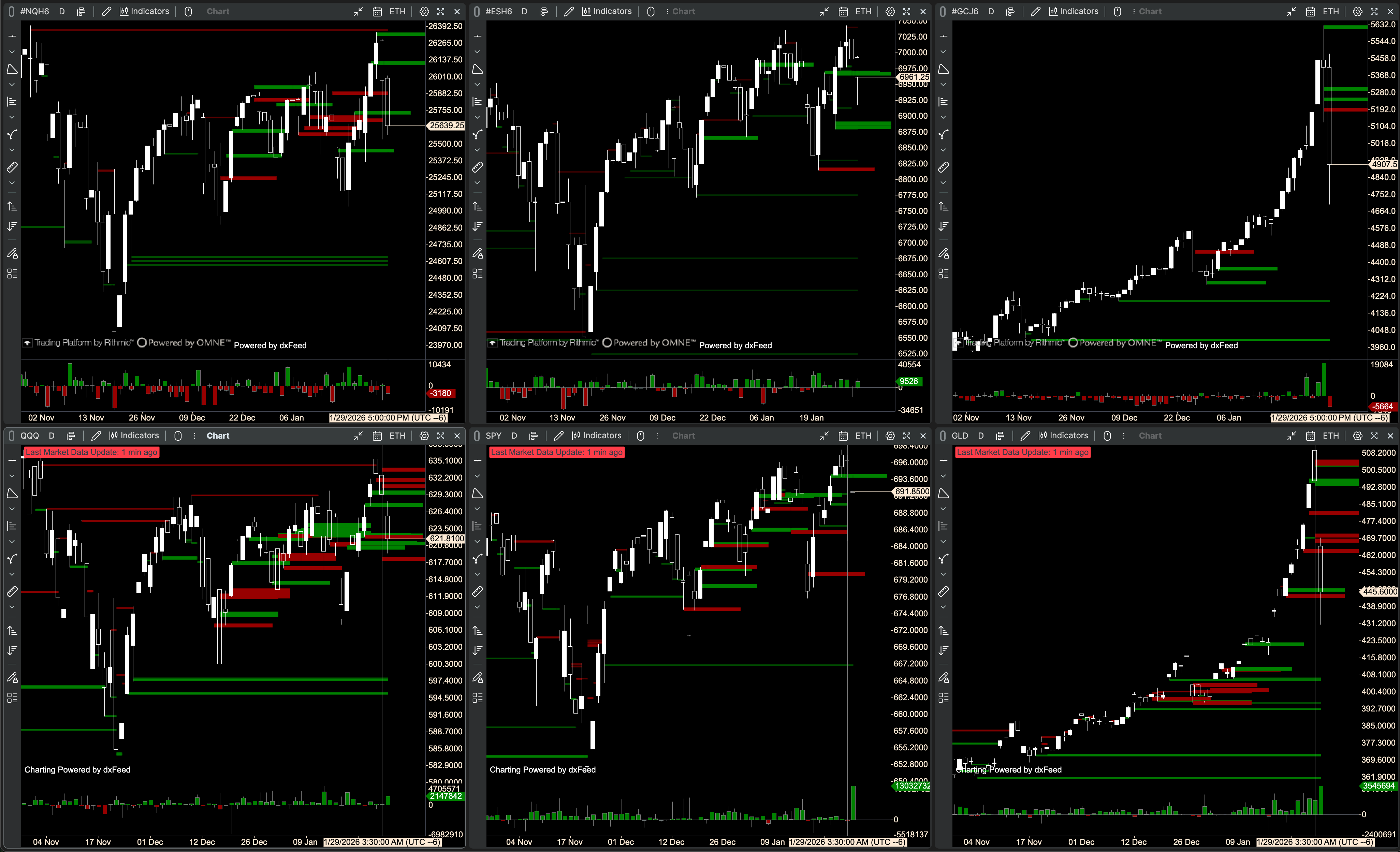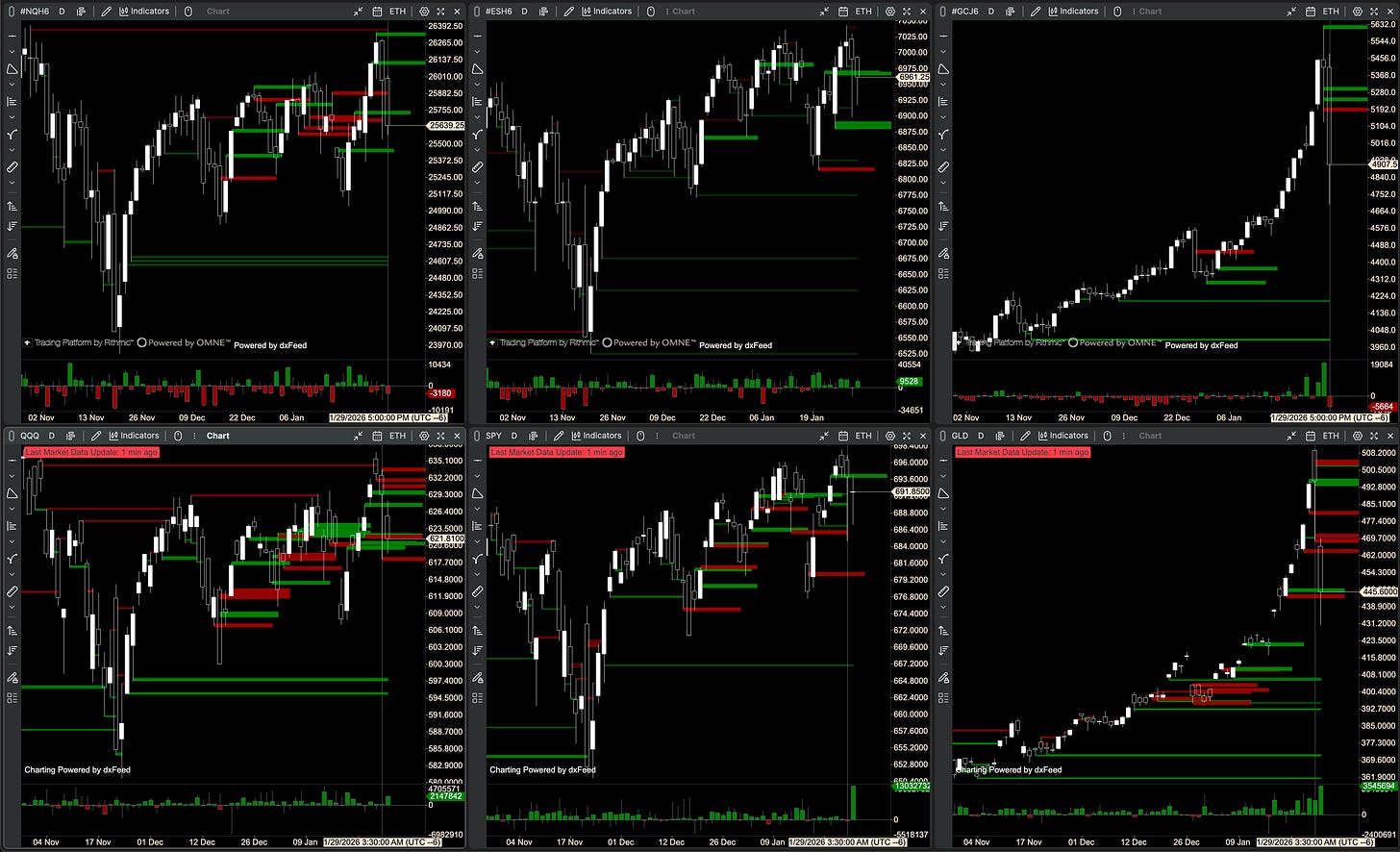 NQ and ES pushed toward new highs and then snapped back to key November “pin” areas, setting up clear decision levels for next week. The standout theme was the disconnect between futures vs ETF flow: NQ’s order flow/CVD leaned heavier while QQQ and SPY looked stronger. Gold is crazy, ripping to new highs and then giving back a huge chunk of the move while GLD flow looked steadier.