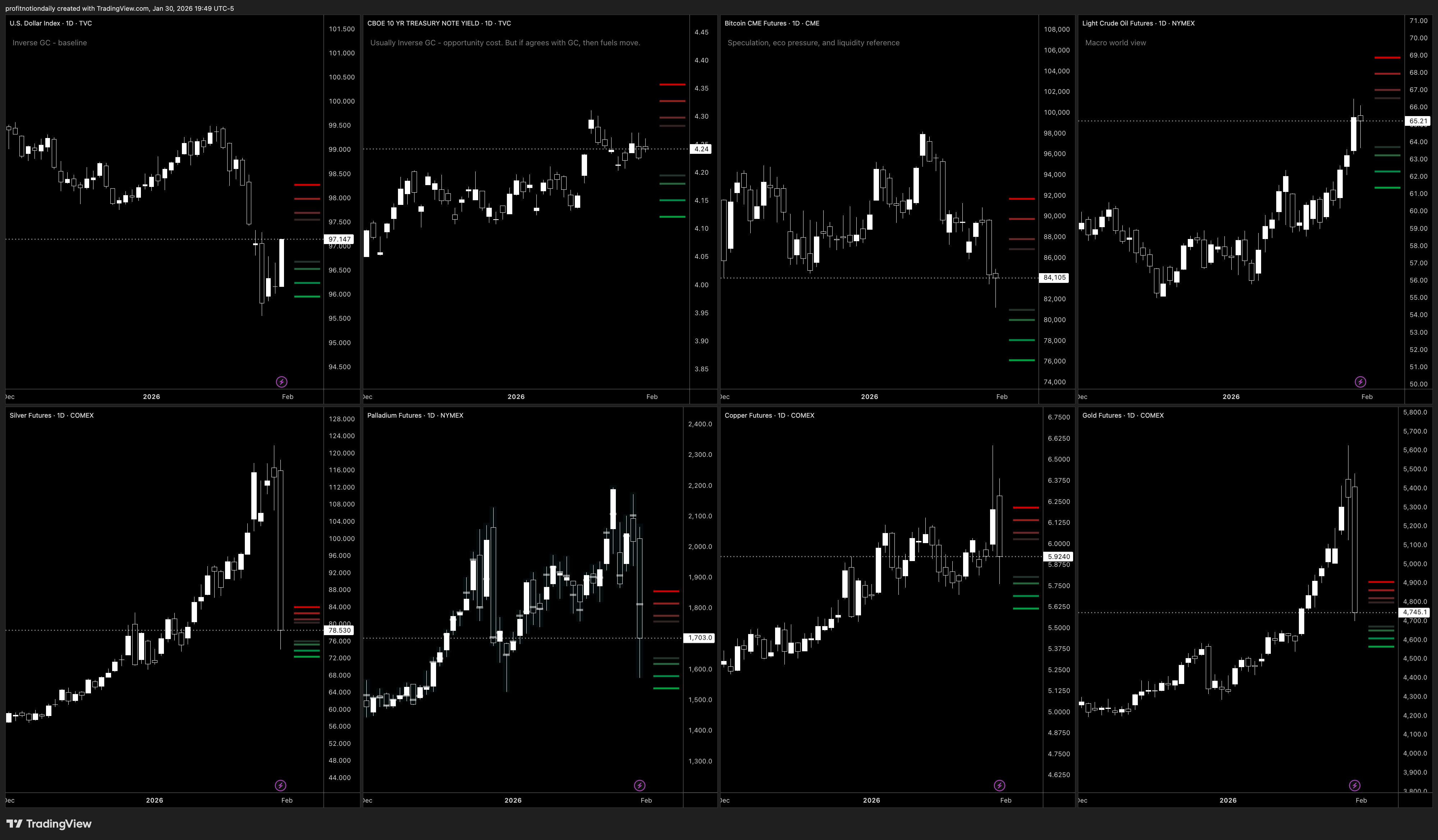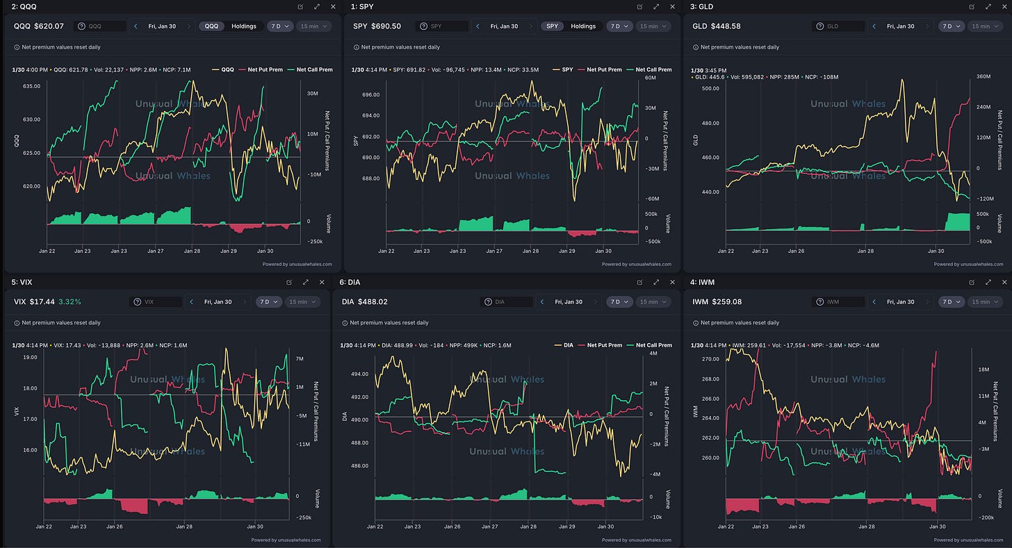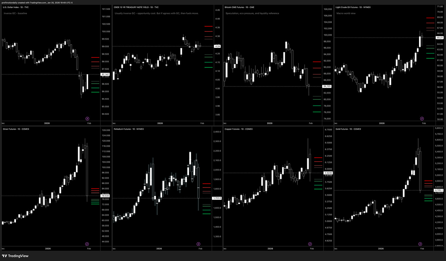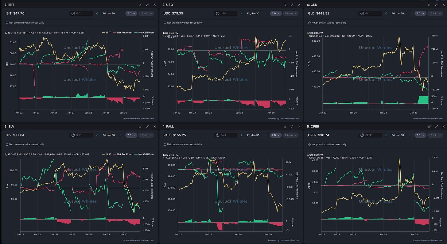 Overall, dollar dropped hard but is trying to stabilize, which usually helps commodities if it stays weak (and it may also be reacting to shifting Fed/policy expectations). Yields are still high even after a small dip, which can keep tech and the broader market from getting too comfortable on rallies. Bitcoin cooled off and the options activity looked more cautious. Oil is moving higher again, which can keep inflation worries alive. The metals (silver, palladium, copper) made big runs and then gave a lot back—so next week is about whether buyers come back in, or if traders stay hesitant after getting burned.