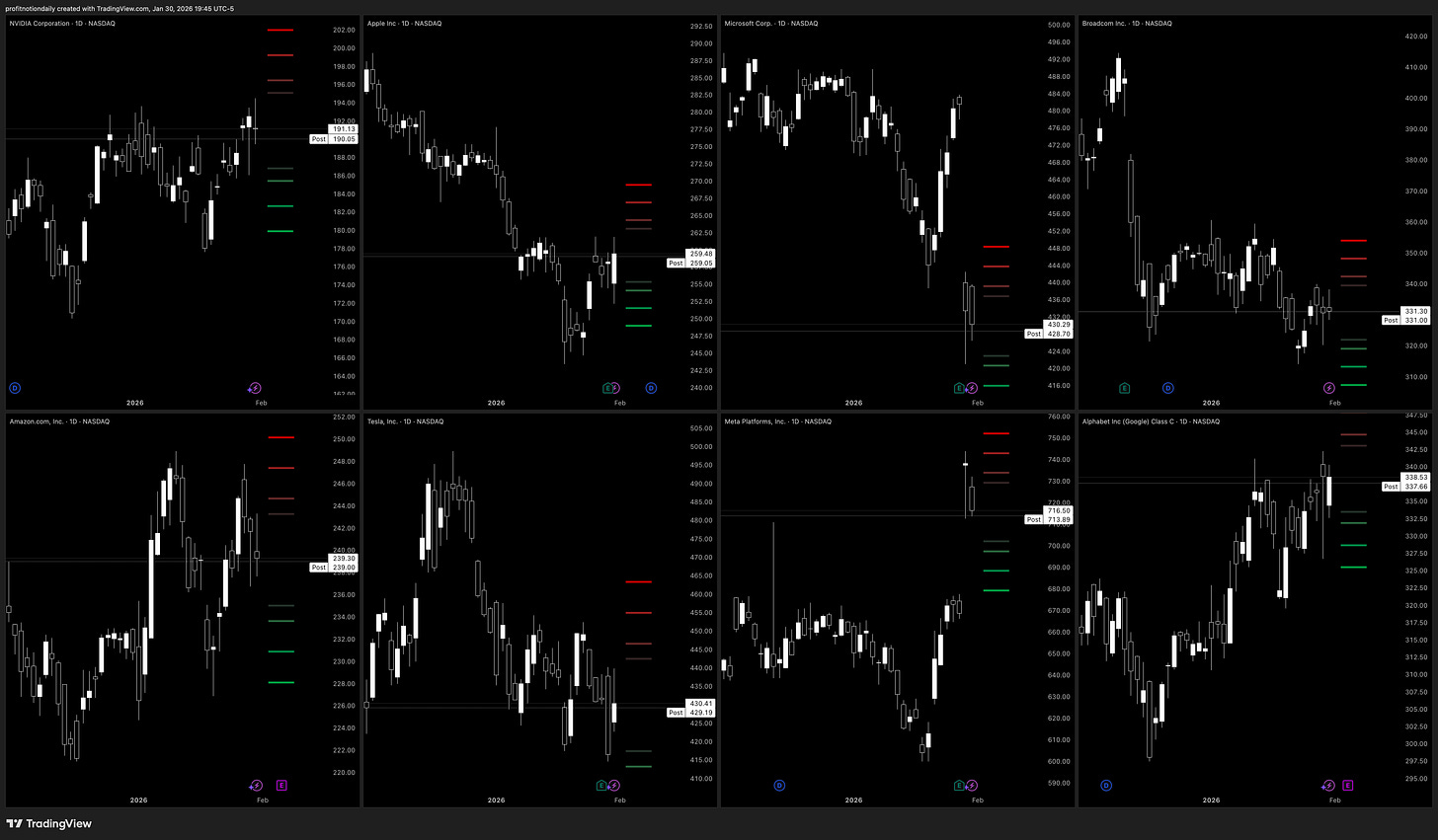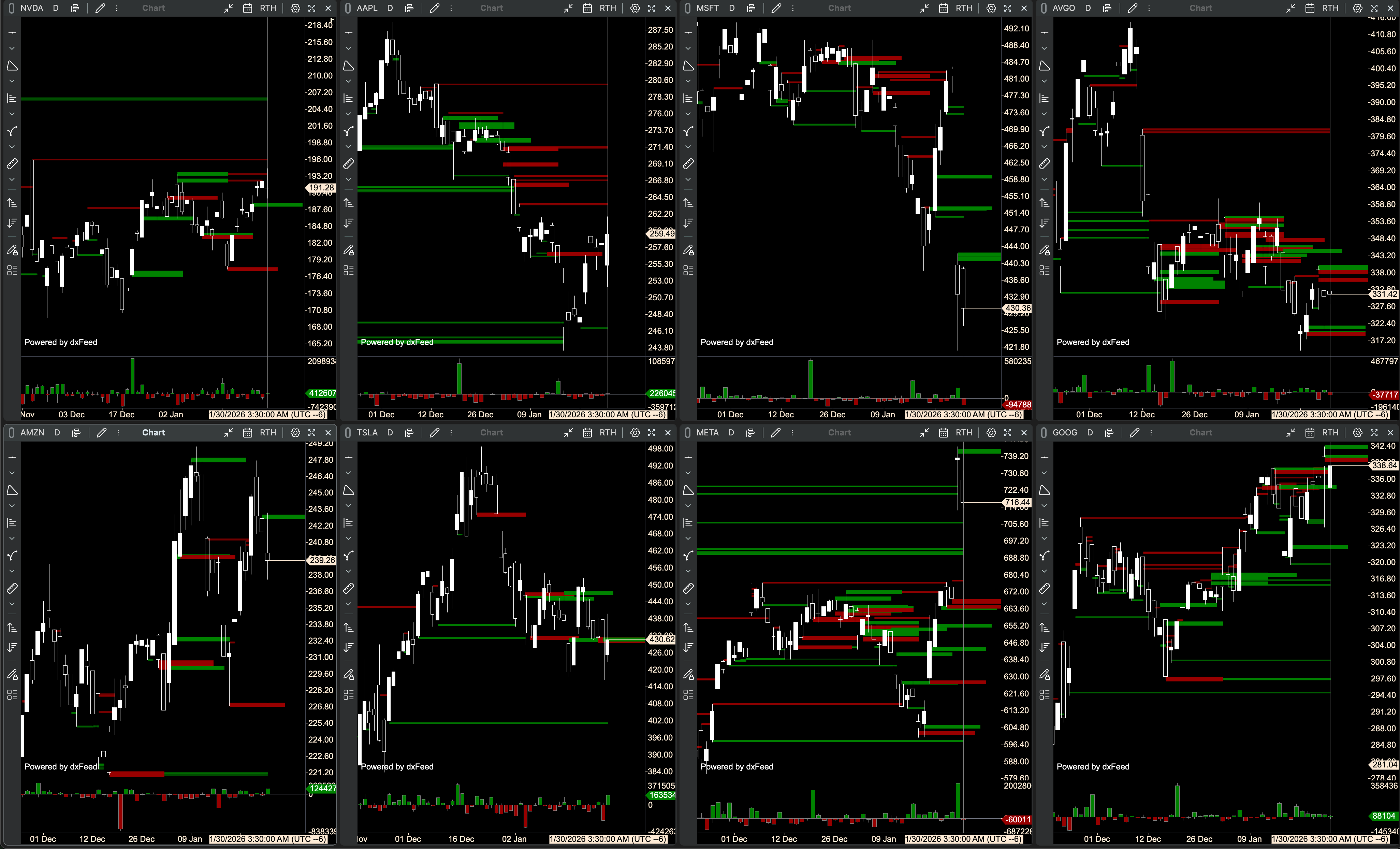 Overall, strength is concentrated in META/GOOG/NVDA, while MSFT/AVGO/TSLA look more fragile or in a range. AAPL is still working through overhead imbalance/absorption. Lets see if the strong names can stay strong and give time for the weaker names to catch up.