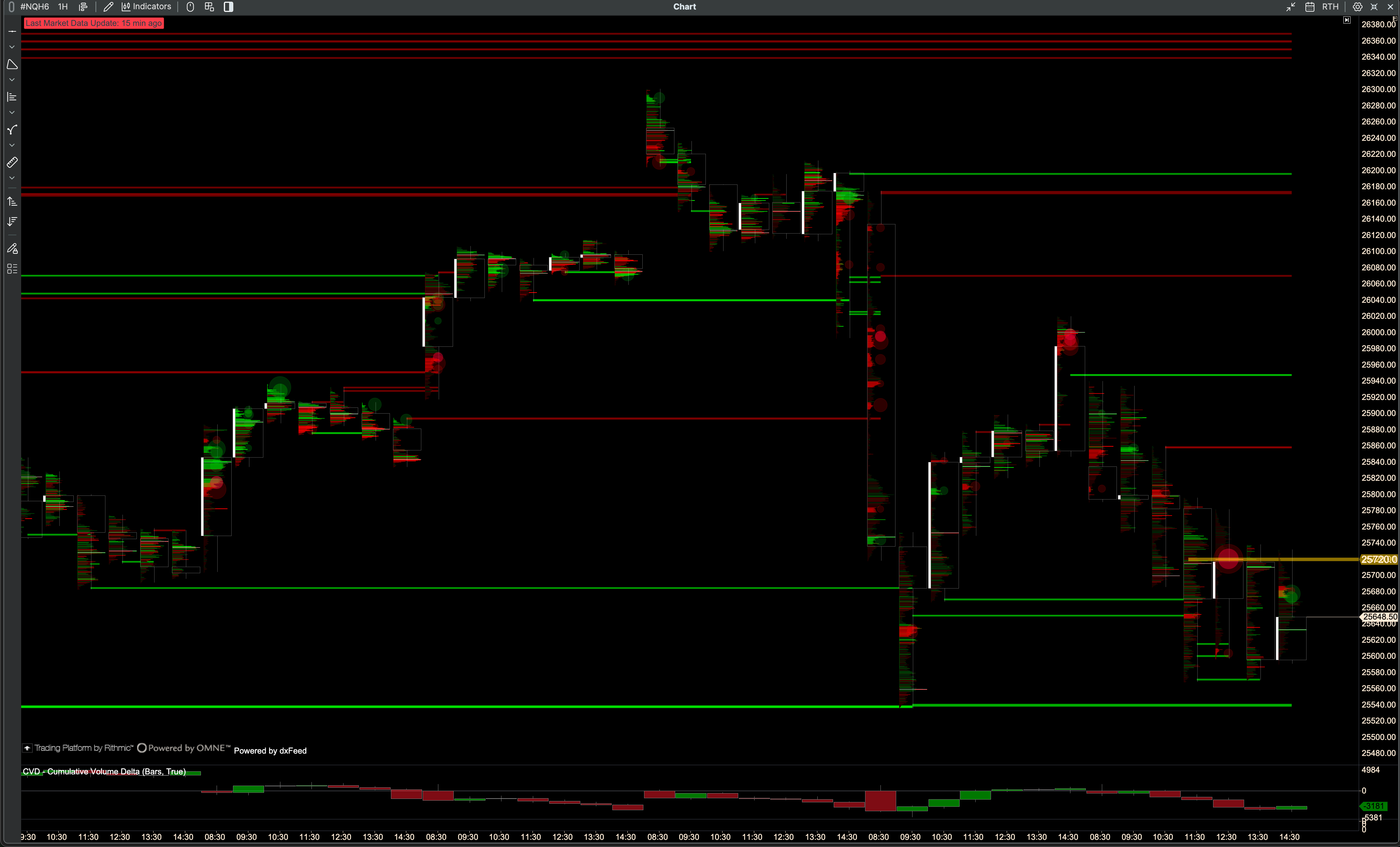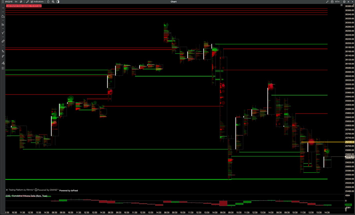 NQ had bullish Imbalance/Absorption at the highs, while QQQ showed bearish. Lots of bullish levels at the current pin levels (25650s / 620s)