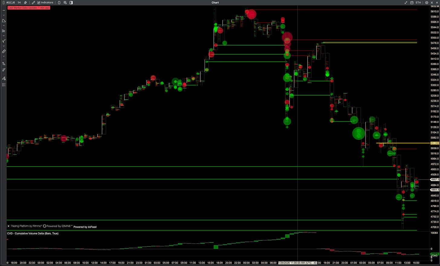 Big buying imbalance on GC at 5630s, but 505s on GLD has bearish levels. Looks like GC had logs of bullish levels as price fell lower, while GLD showed bearishness. 445s on GLD seems to be a coin-flip level, lets see if it holds or breaks down.