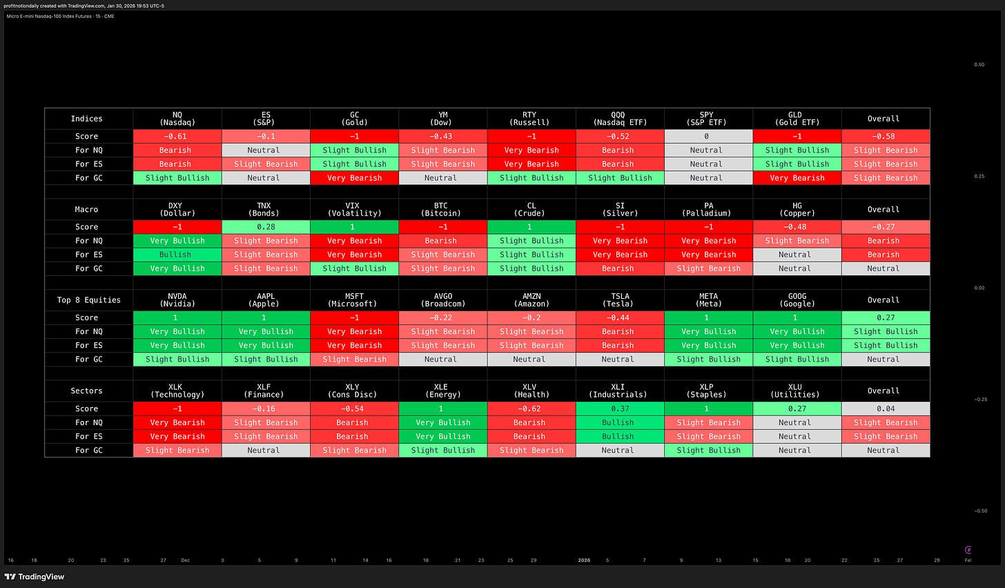 Proprietary matrix powered by AI that provides market price action summary and what it means for NQ, ES, and GC futures.