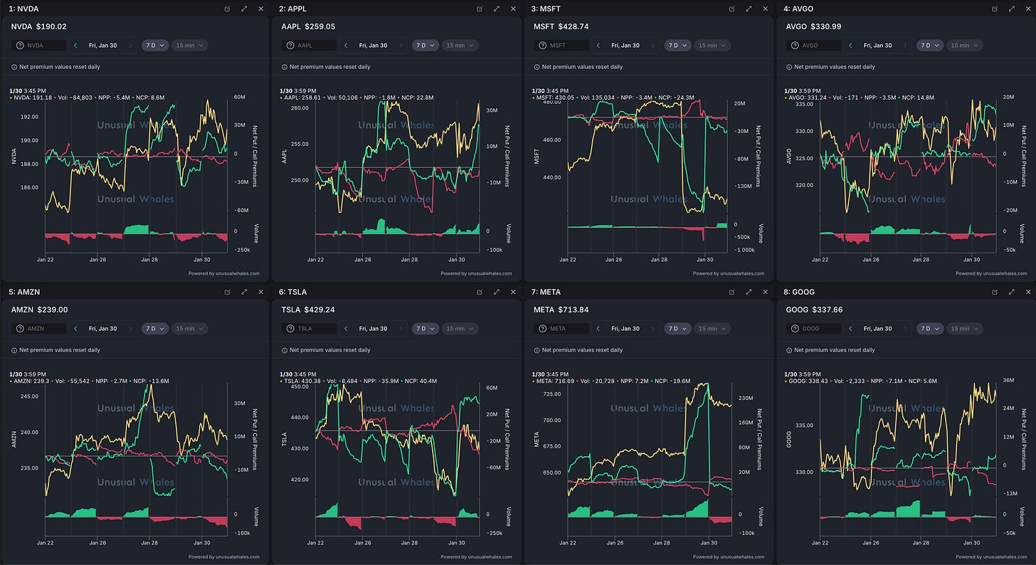 Monday started with strong volume delta, but neutral options flow, then over the week volume trended toward neutral while calls picked up Thursday and Friday.