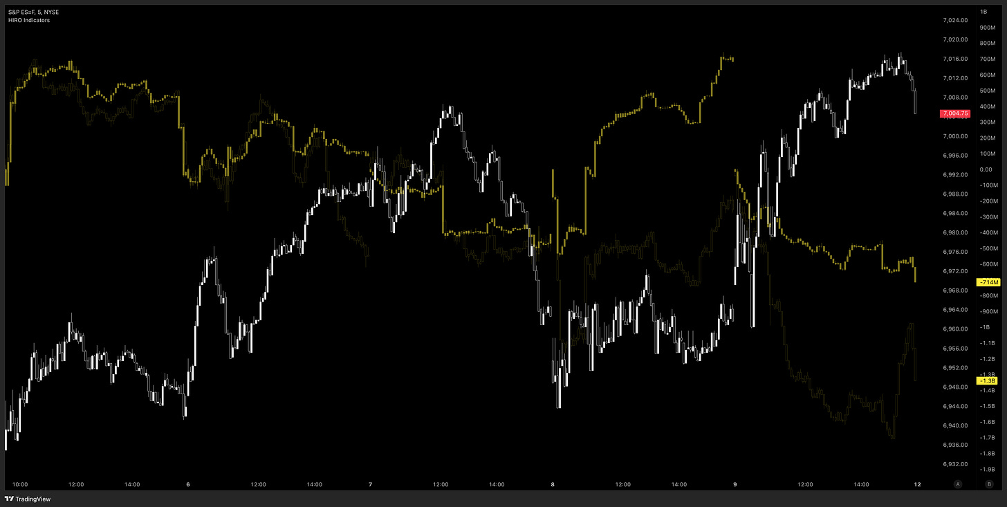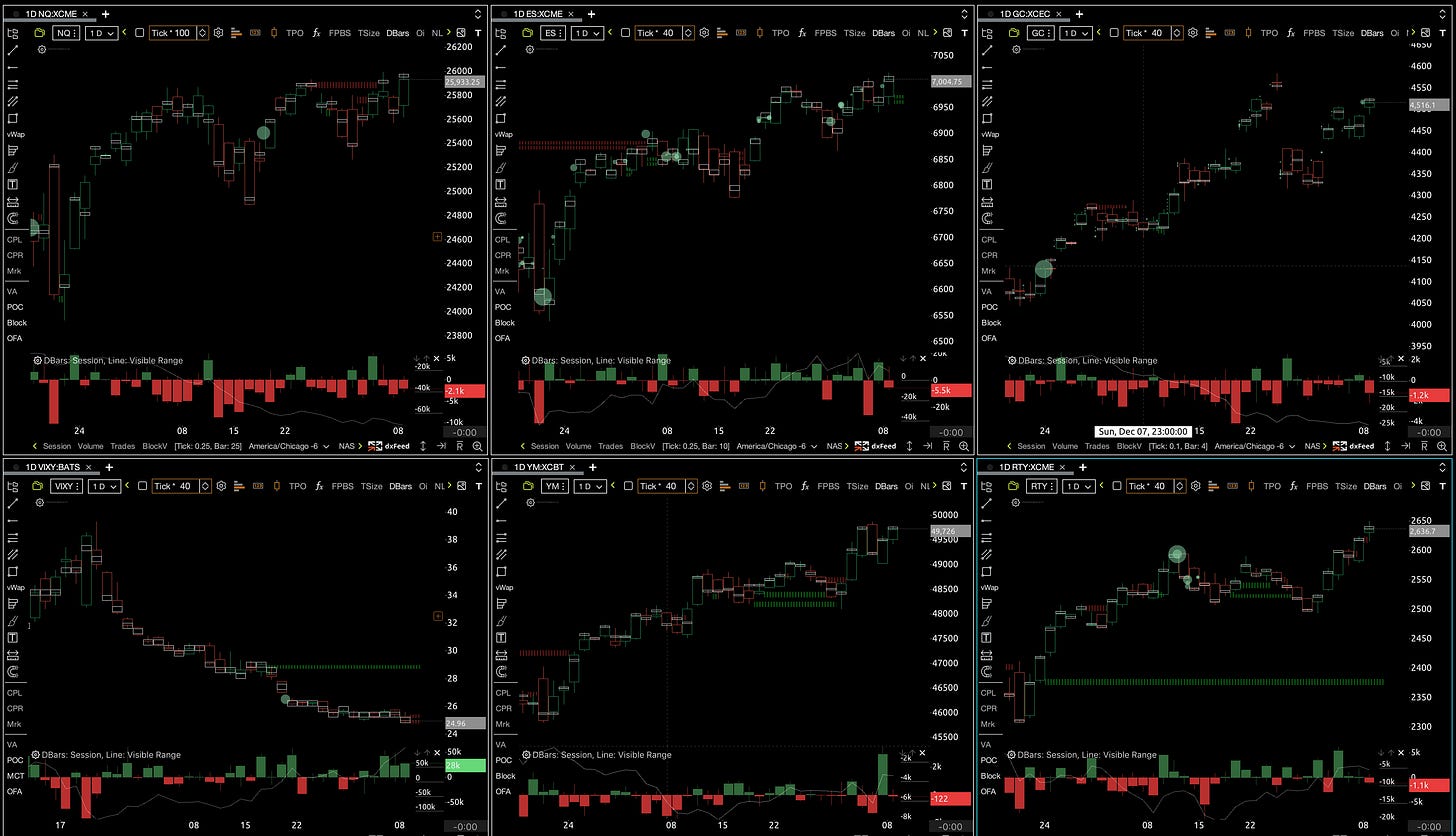 Price made new highs on Weds, and then again on Friday, closing at Weds highs (7005s). If we can print above Friday’s high (7019s), then sky is the limit… but realistically 7060s to 7100s is in play on Monday, however price could pull back to 6950s and still be bullish. Options flow is mixed between ES/SPY options, but SPY is looking more bullish on flow. CVD is holding positive, but Friday did close red, even while price made new highs with POC near highs. Watch how that divergence plays out on Monday.