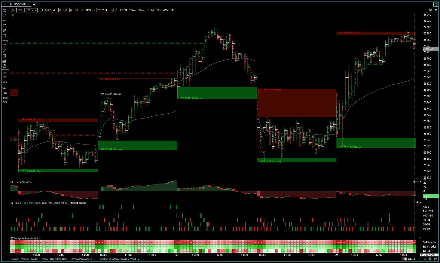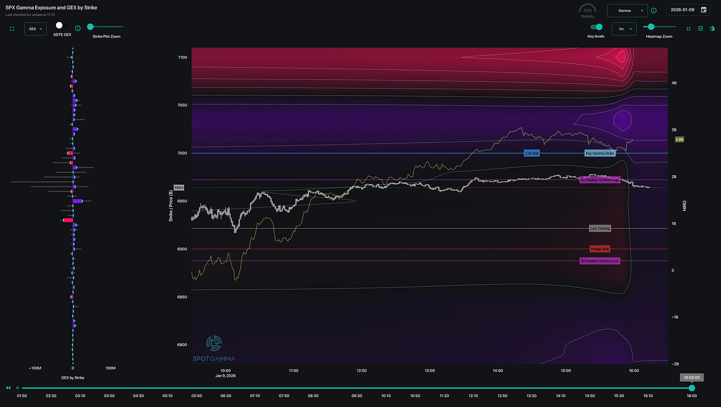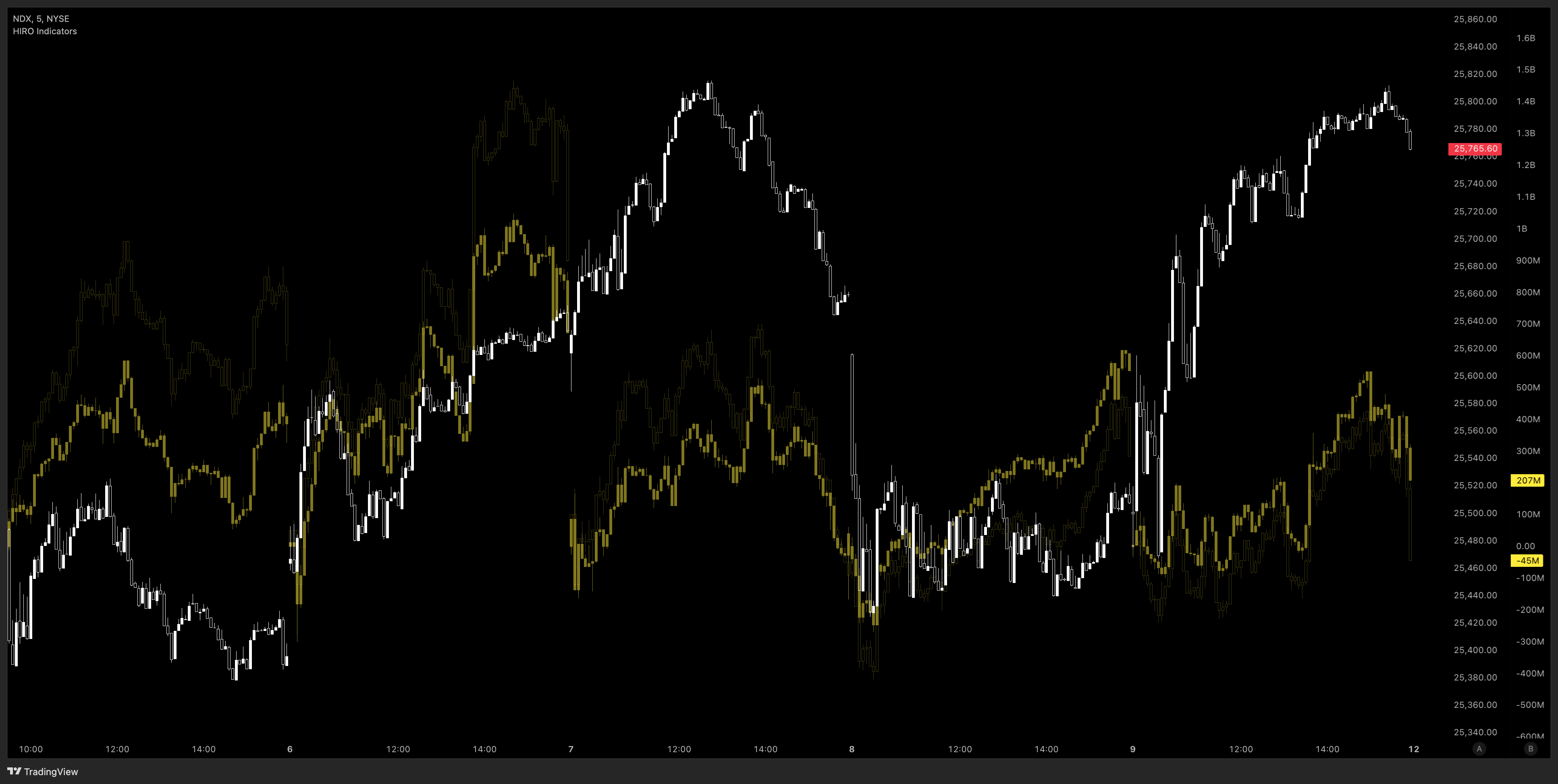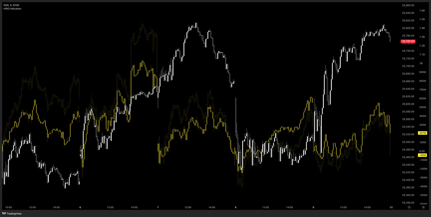 NQ still printing higher highs and higher lows, but the last few sessions feel like they’ve been powered more by short-dated (0DTE) options flow. Price seems to follow that flow pretty consistently all week.