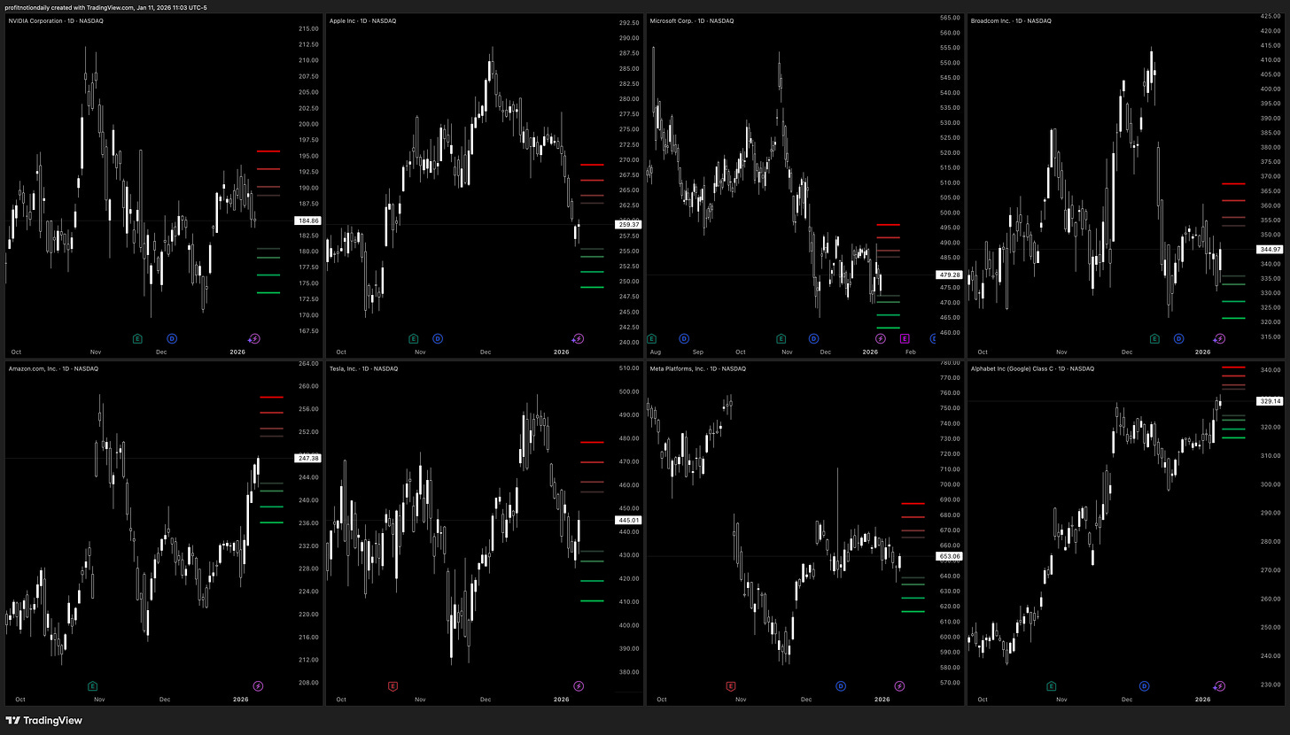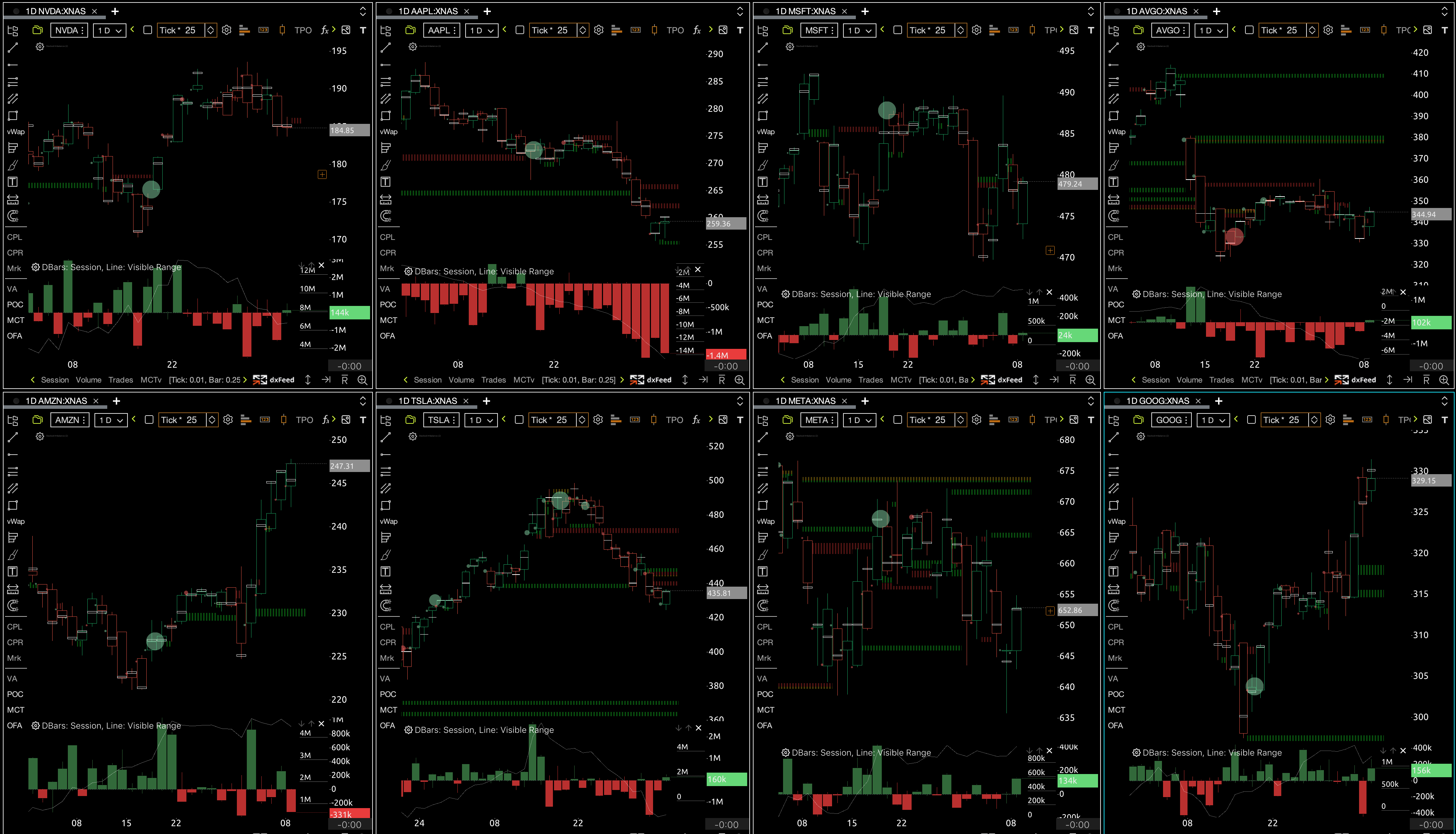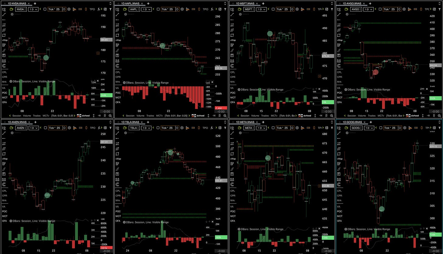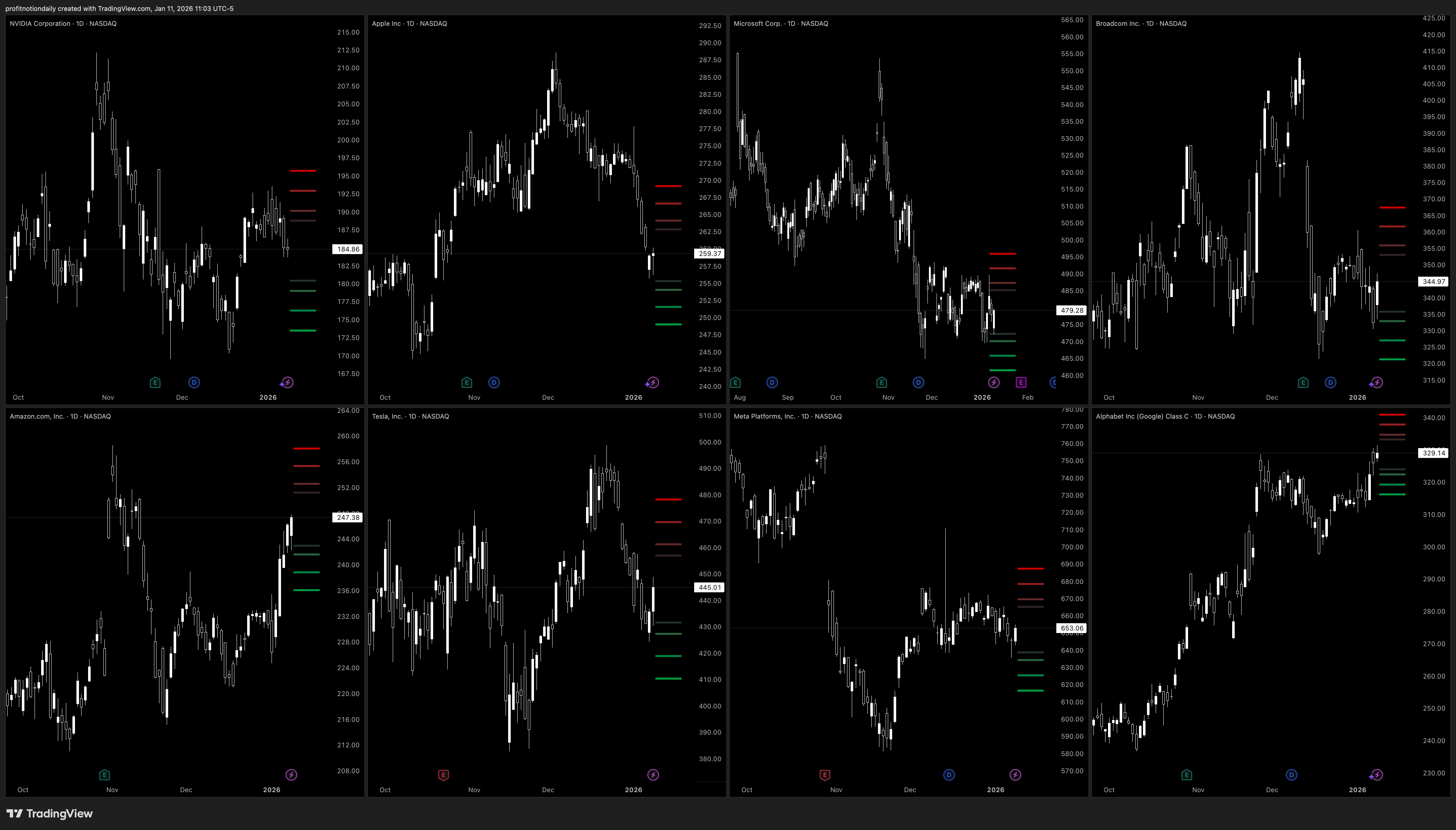 AAPL and TSLA are weakest—Apple is still in a clear slide and sitting on support around the mid-250s, and Tesla has been pulling back hard from the highs and needs to stabilize before it’s trustworthy again.