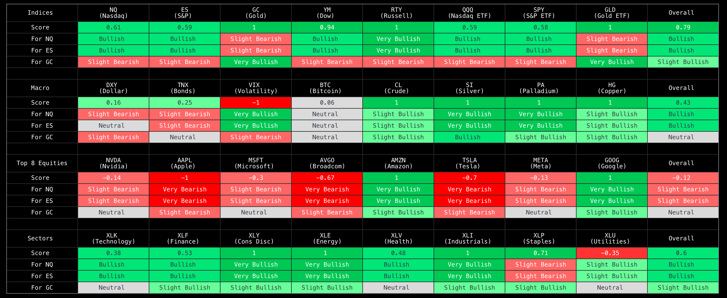 Proprietary matrix powered by AI that provides market breadth and what it means for NQ, ES, and GC futures.